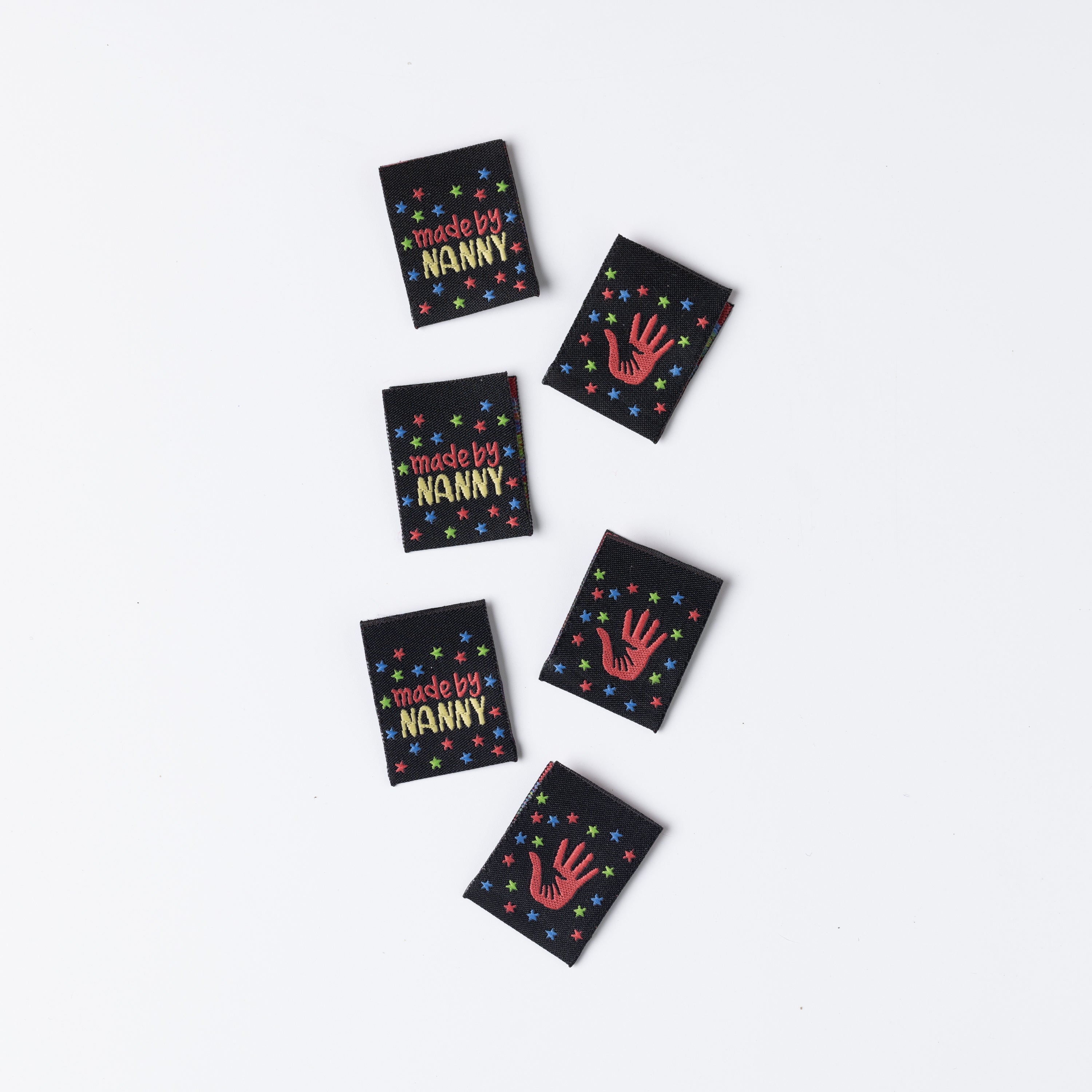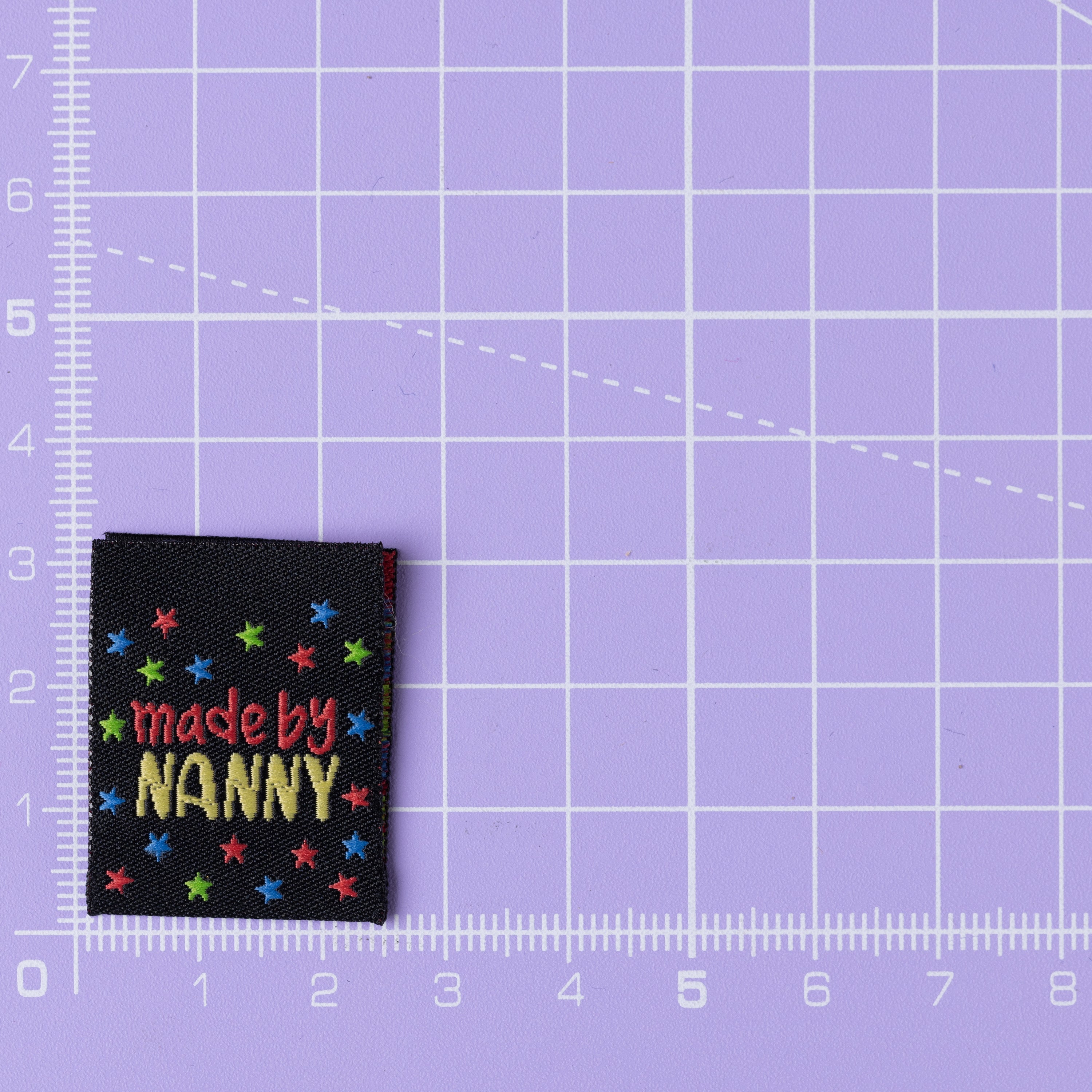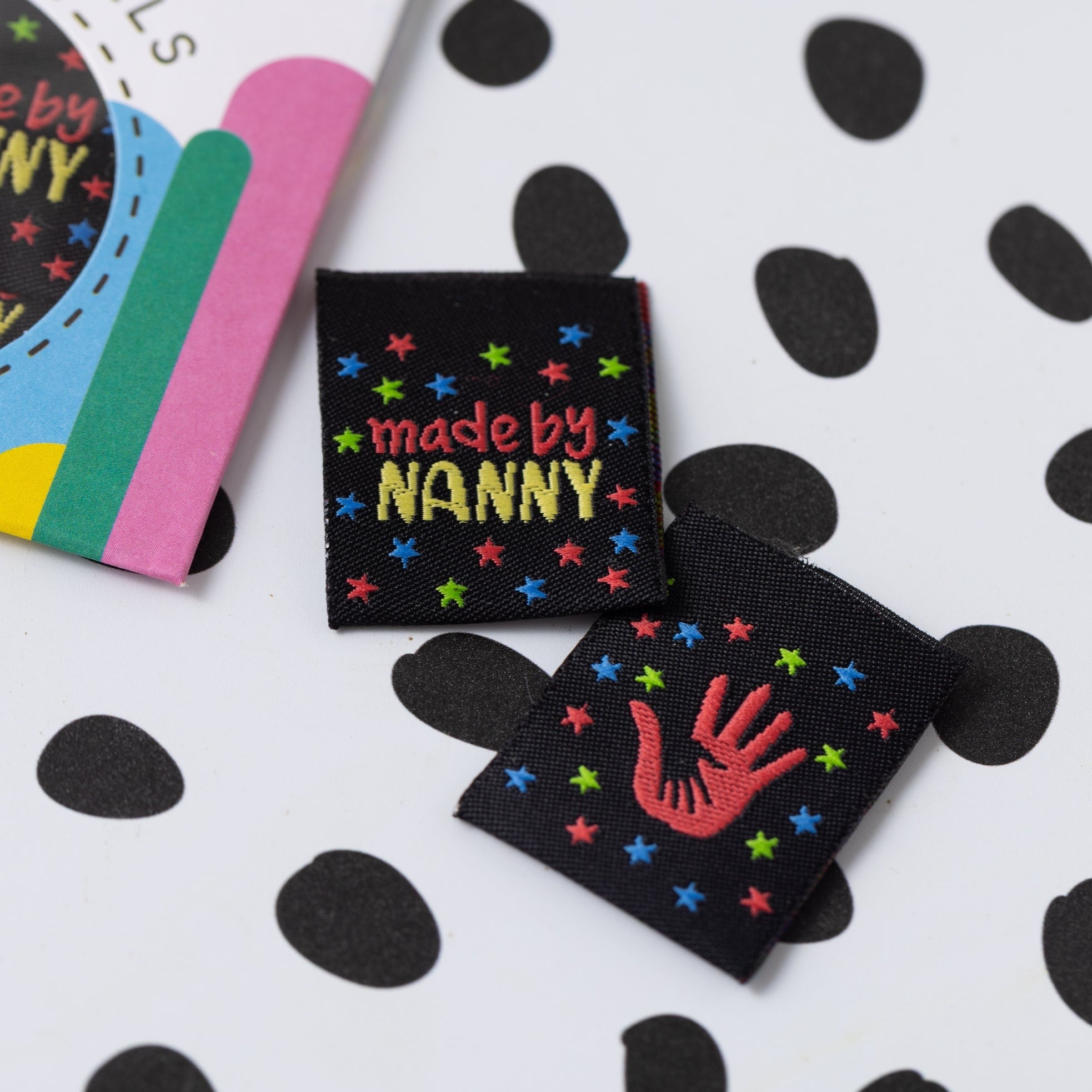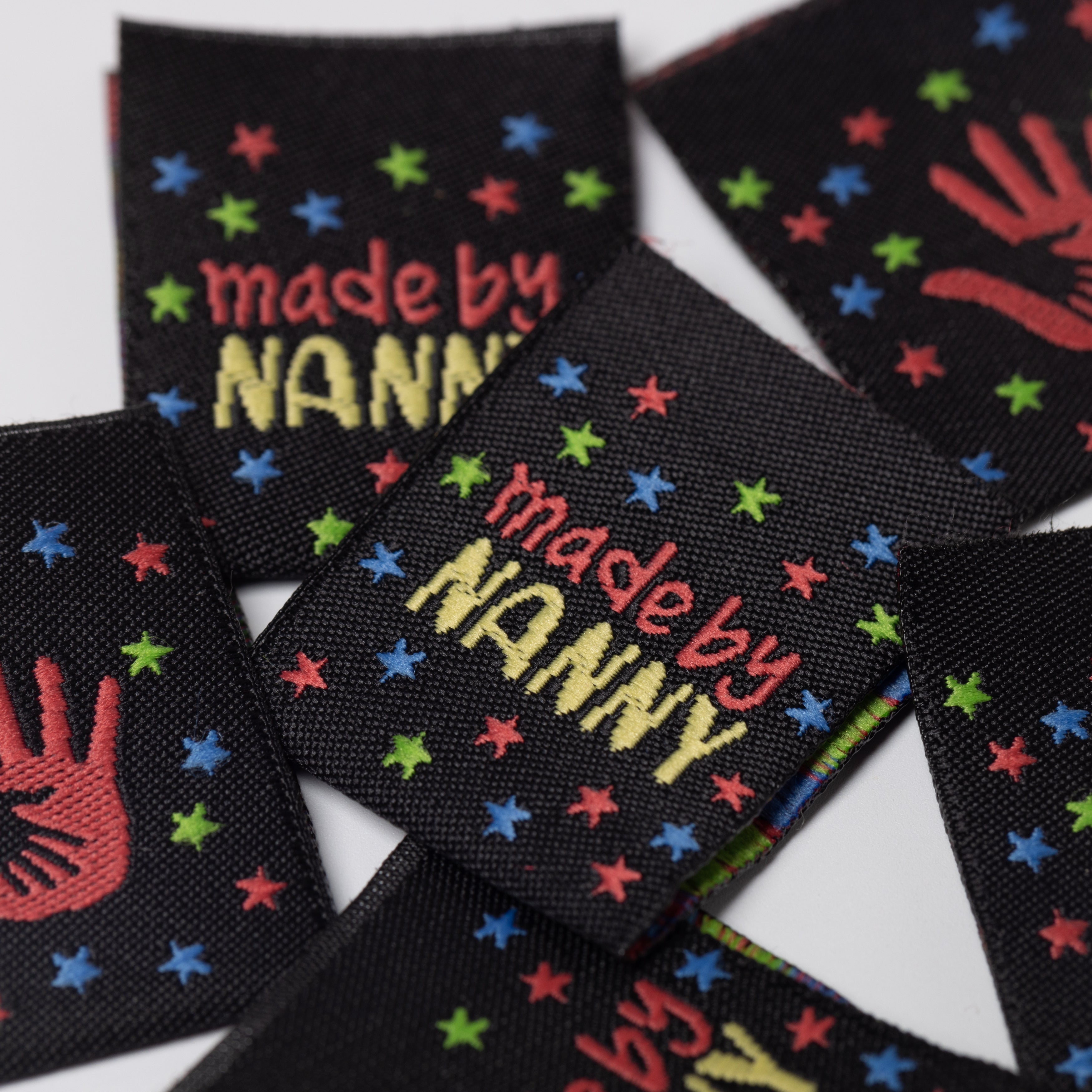 'Made by Nanny' woven in a red and yellow thread with a black background, surrounded by wee stars. After many requests we have added another grandparent to our 'made by' collection! This labels features the popular hand hold image on the reverse side.