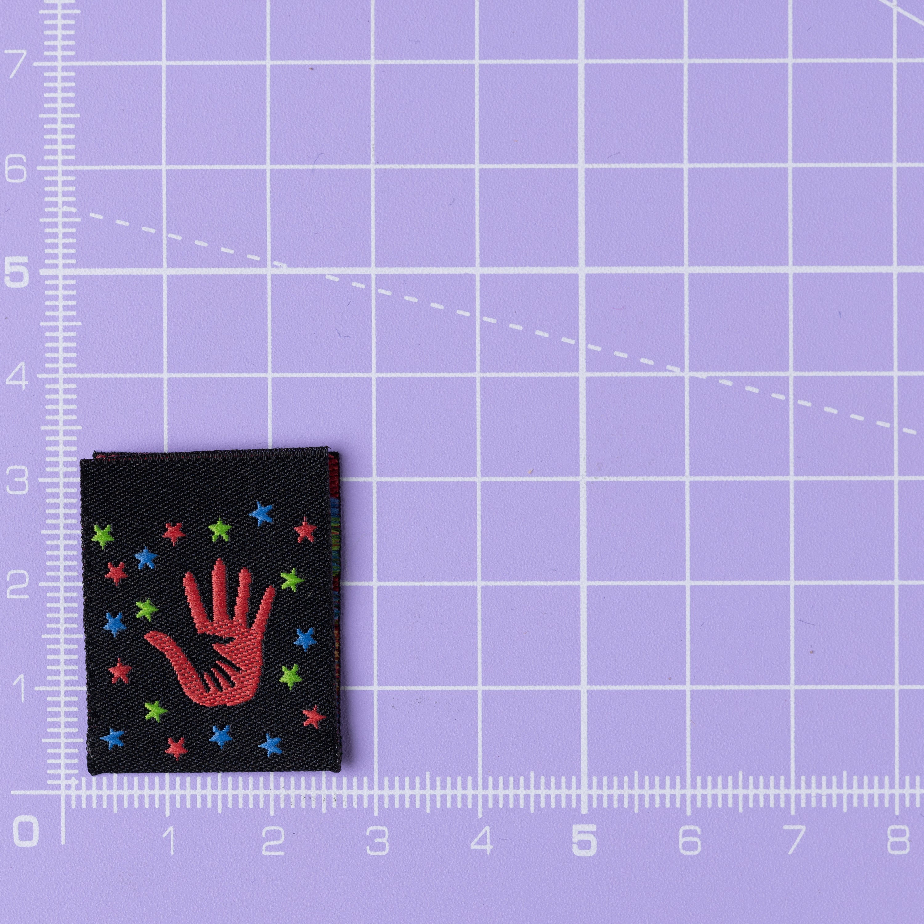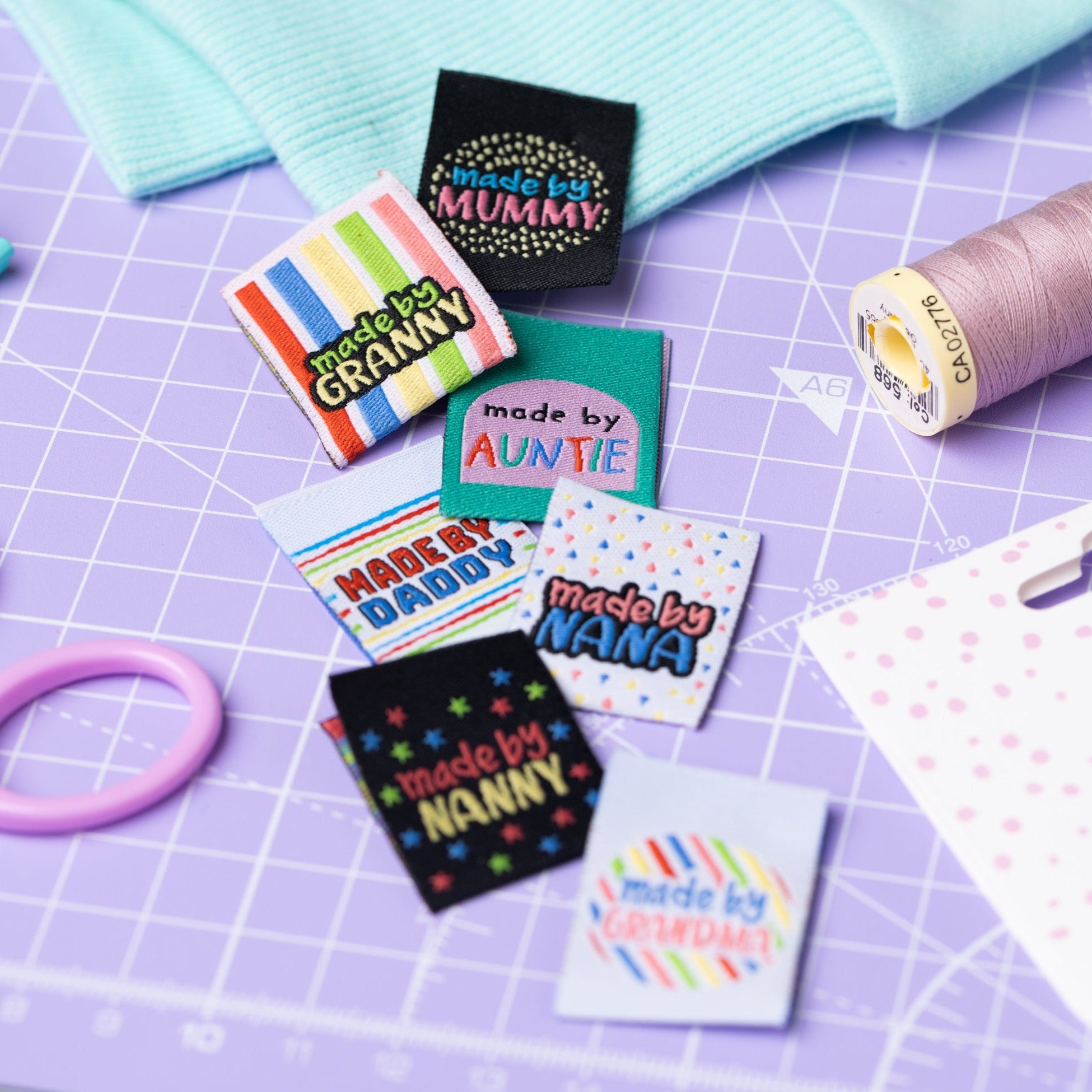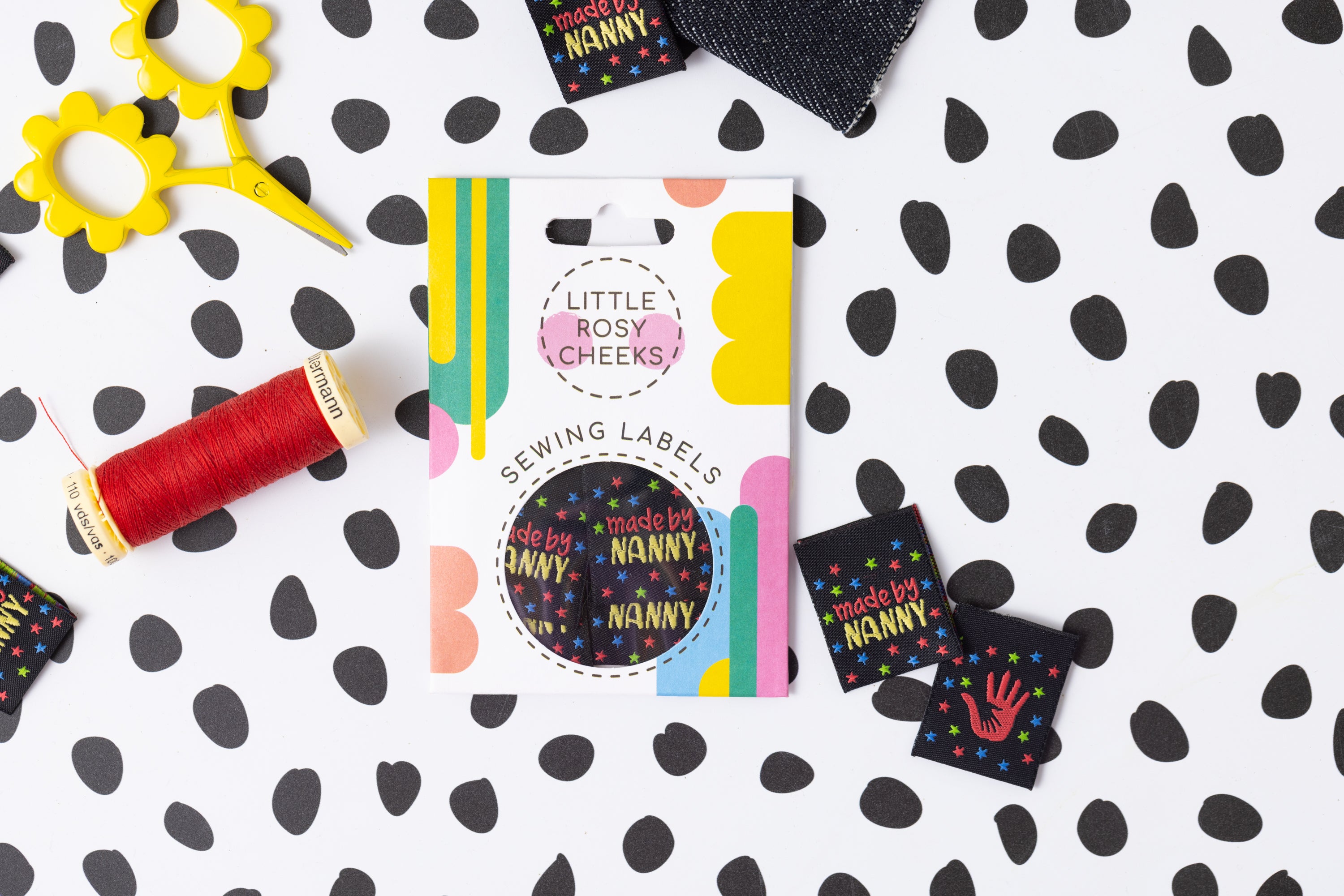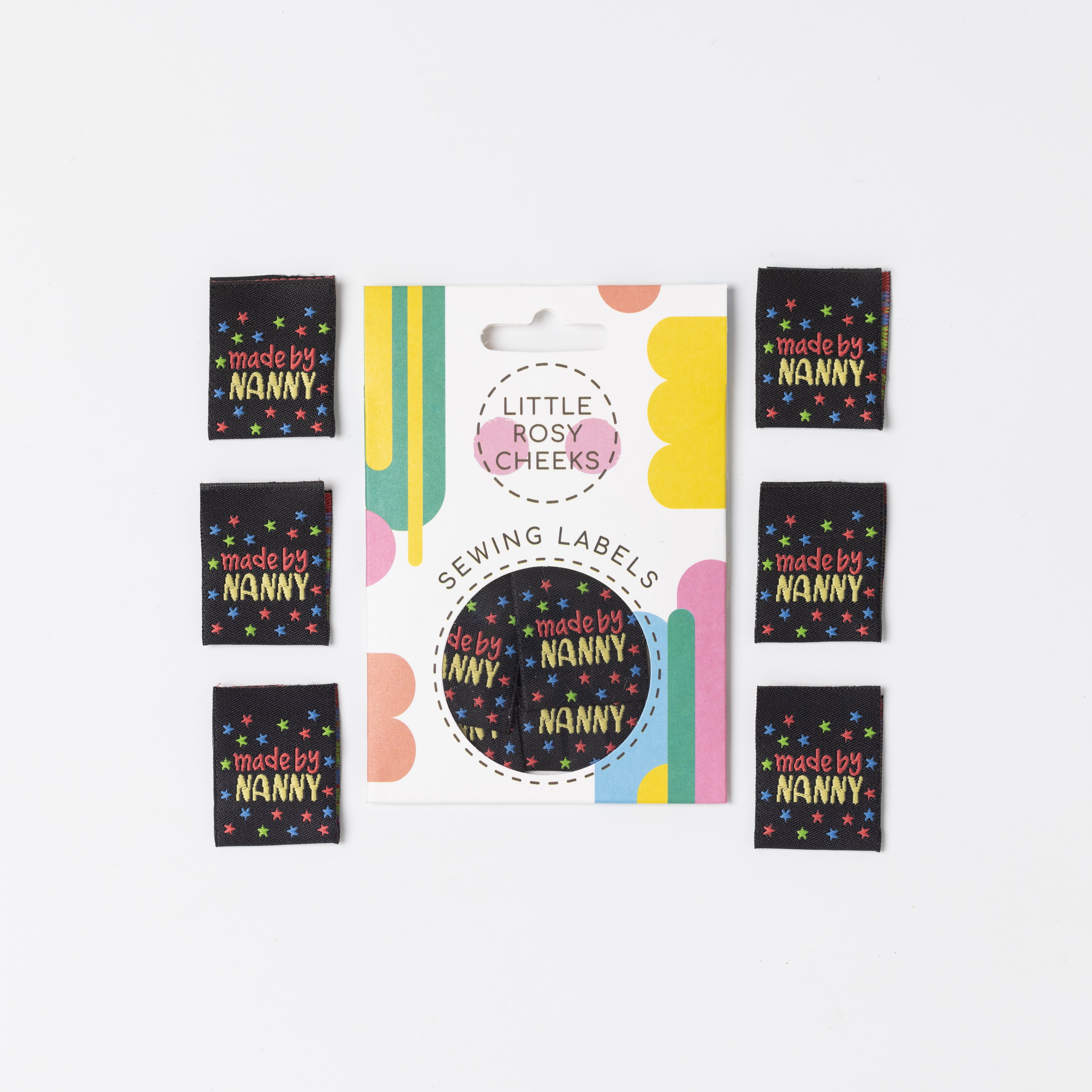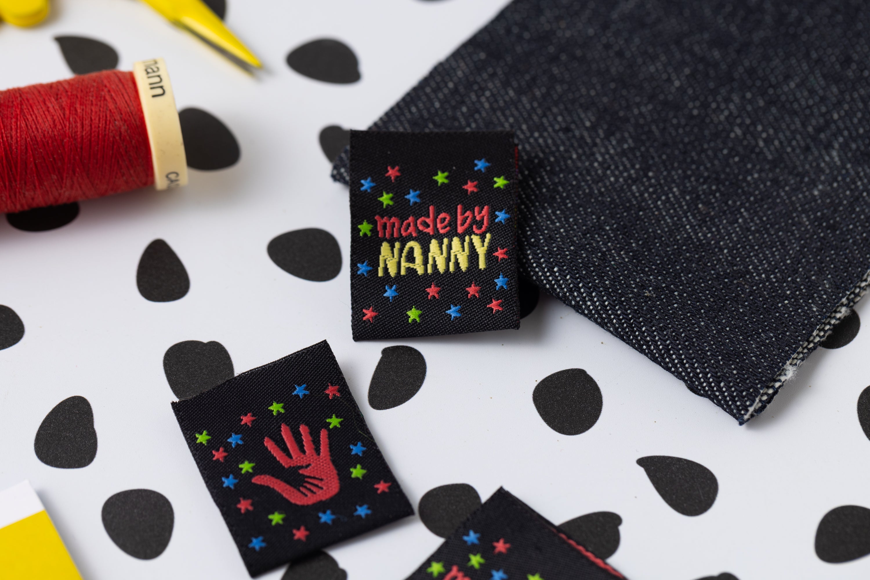 'Made by Nanny' woven in a red and yellow thread with a black background, surrounded by wee stars. After many requests we have added another grandparent to our 'made by' collection! This labels features the popular hand hold image on the reverse side.