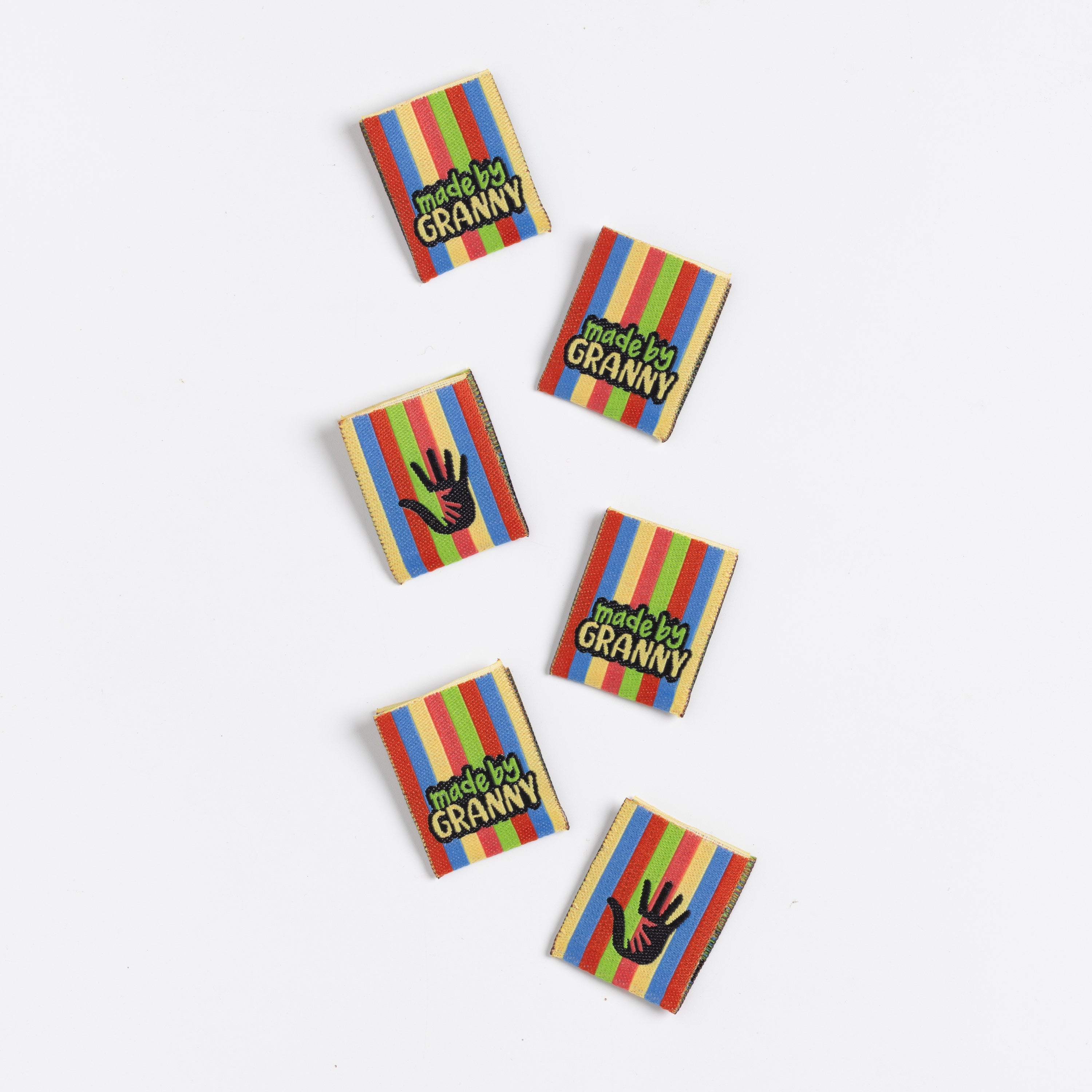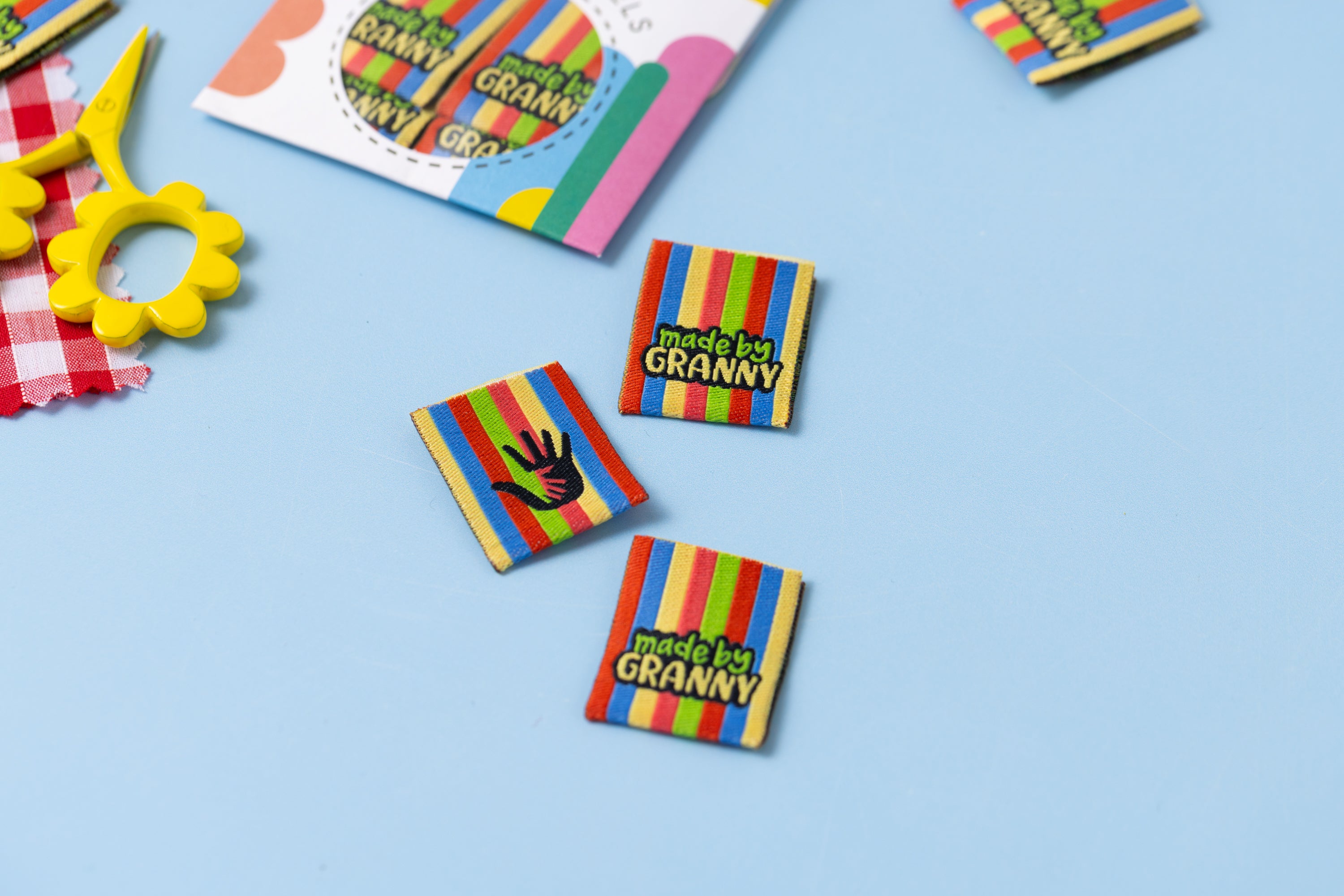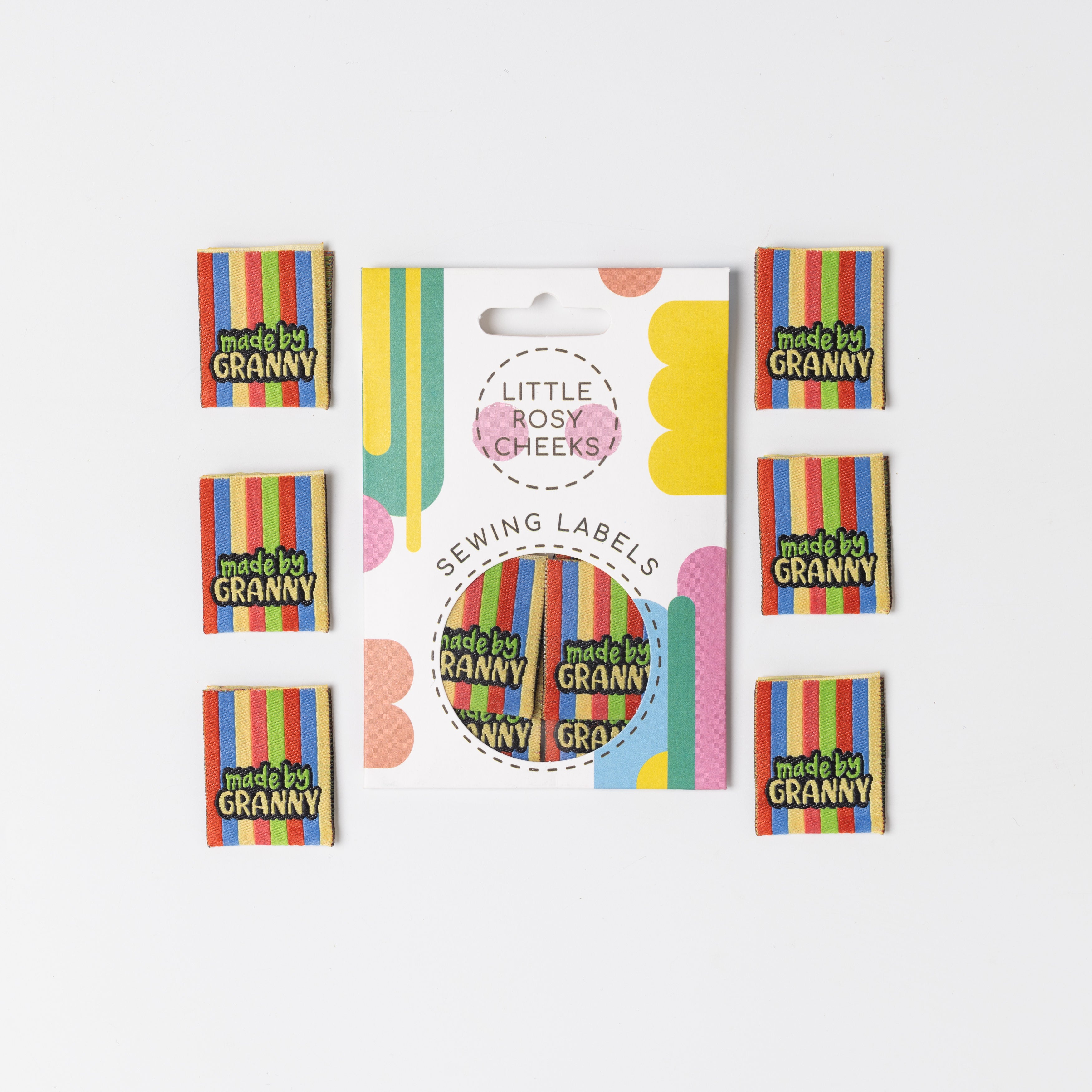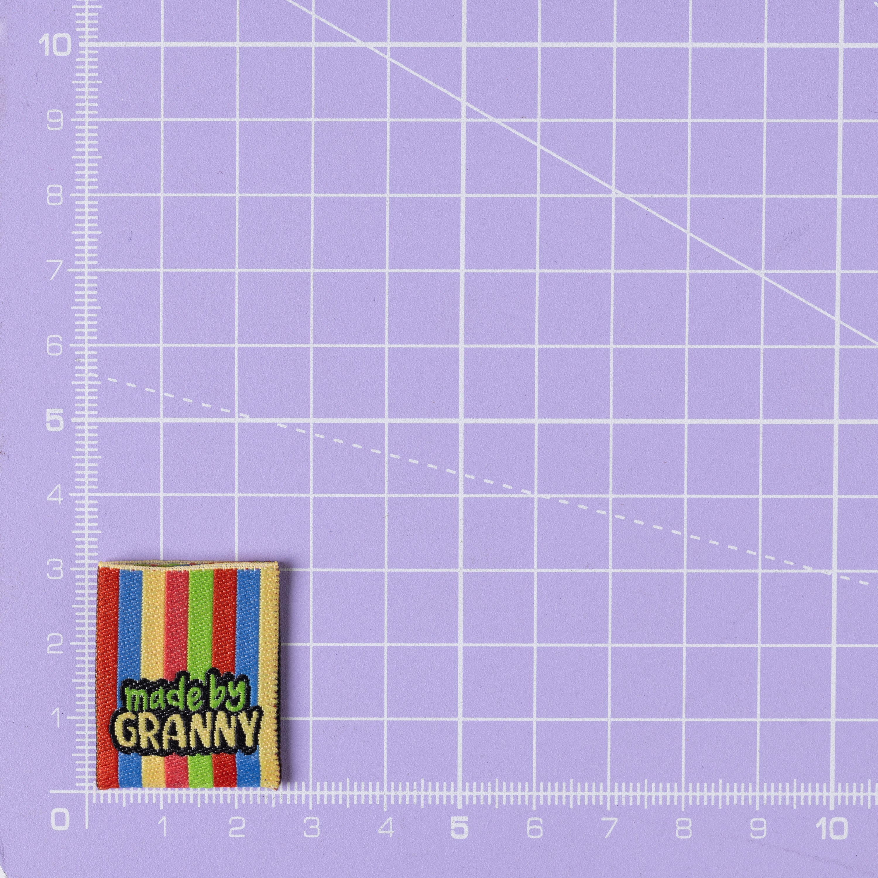 'Made by Granny' woven in a green and yellow thread with a fun stripy background.