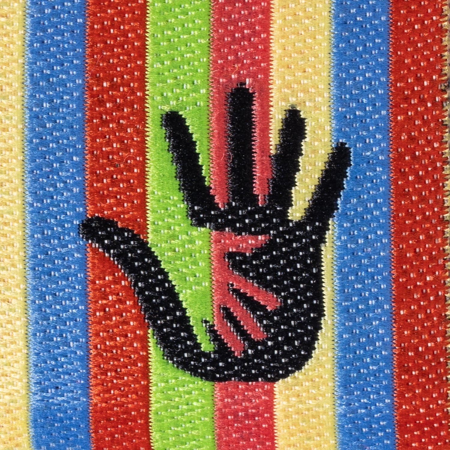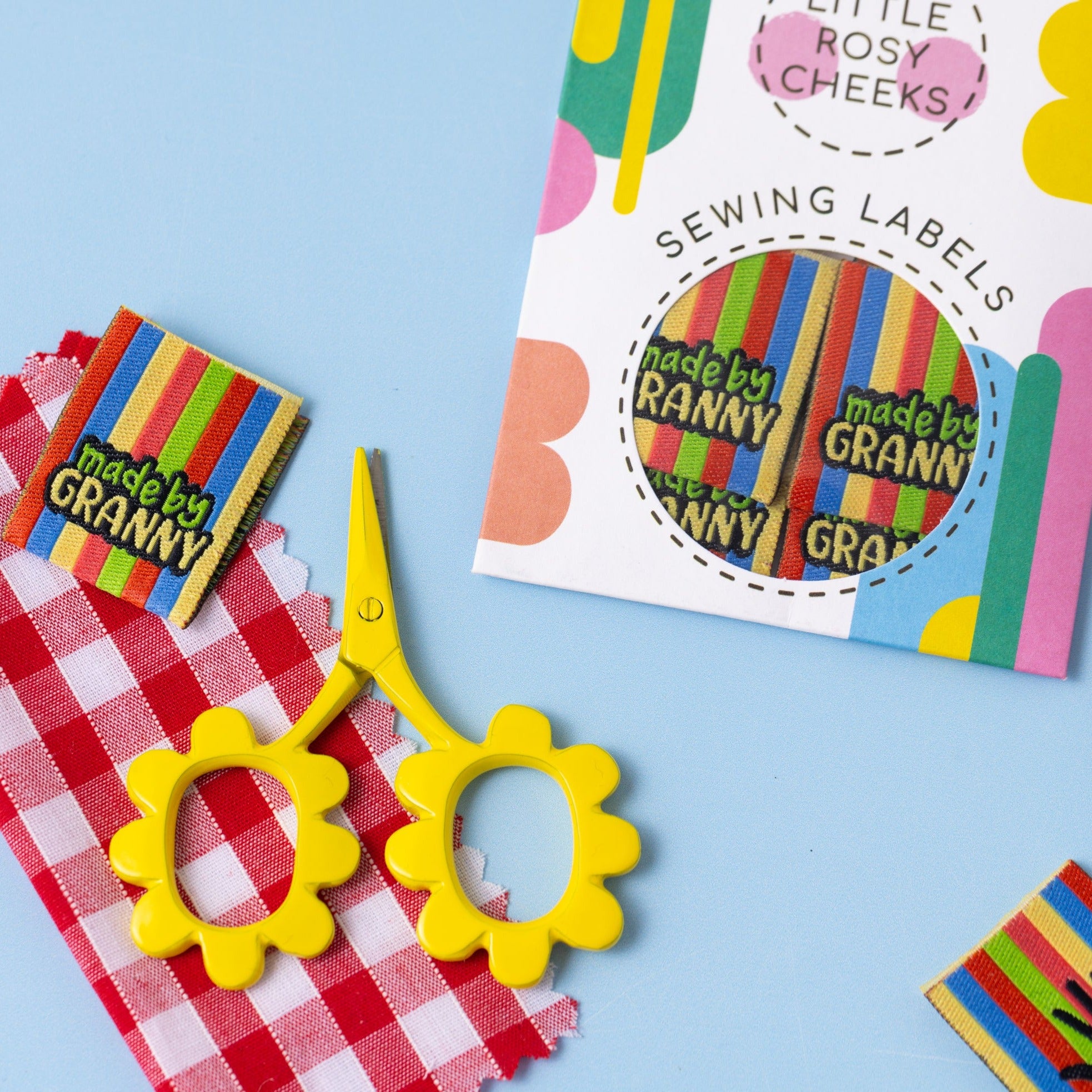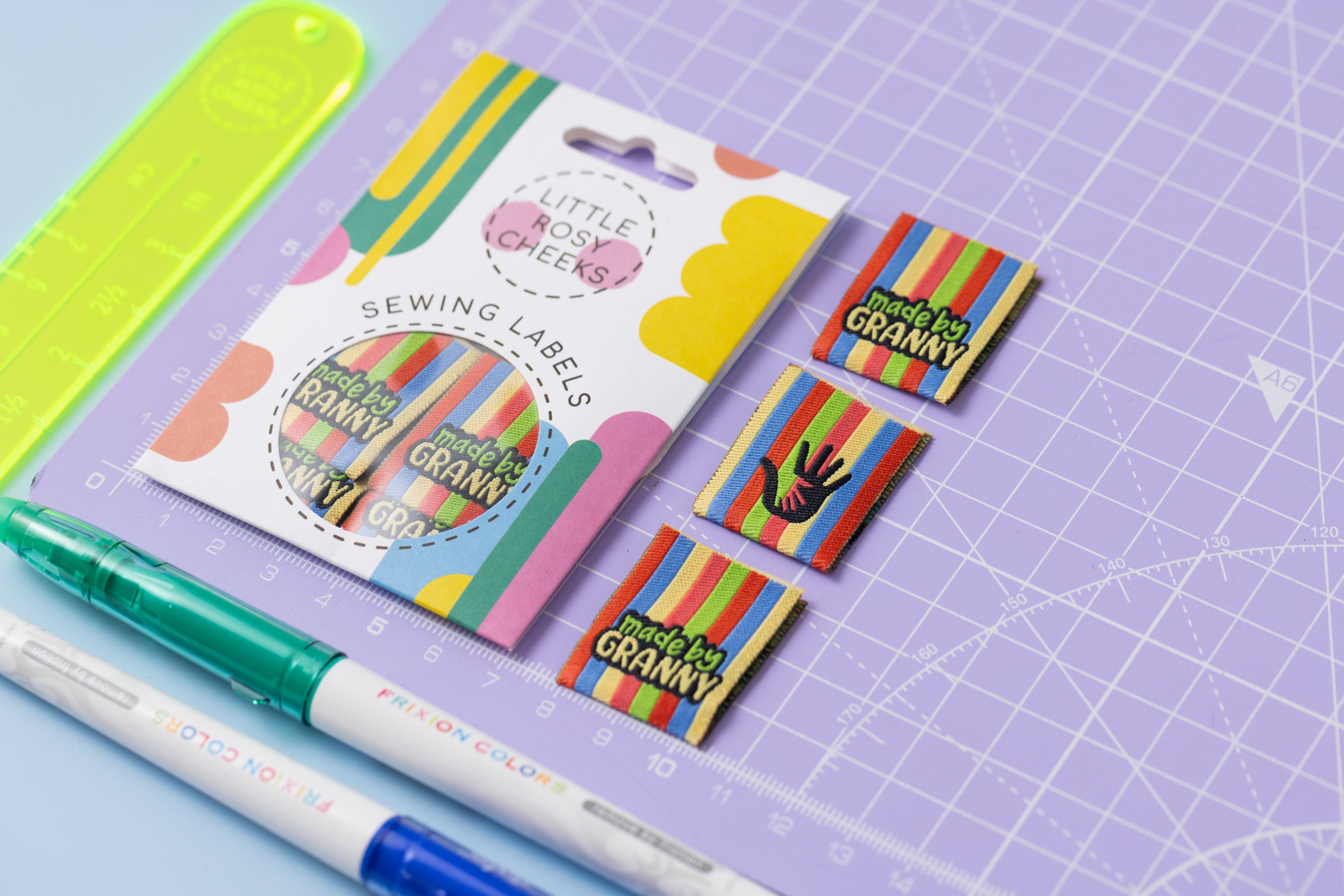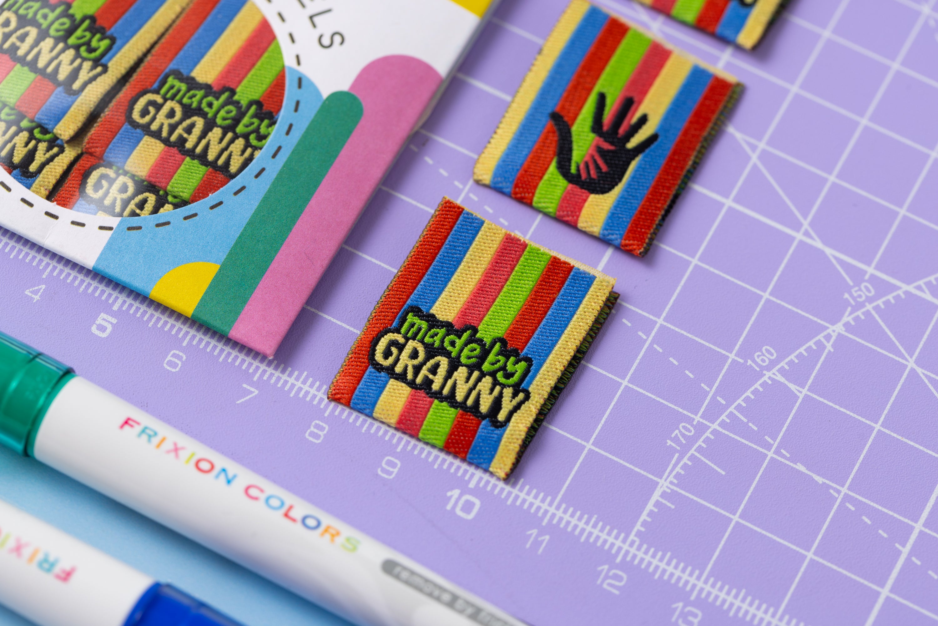 'Made by Granny' woven in a green and yellow thread with a fun stripy background.