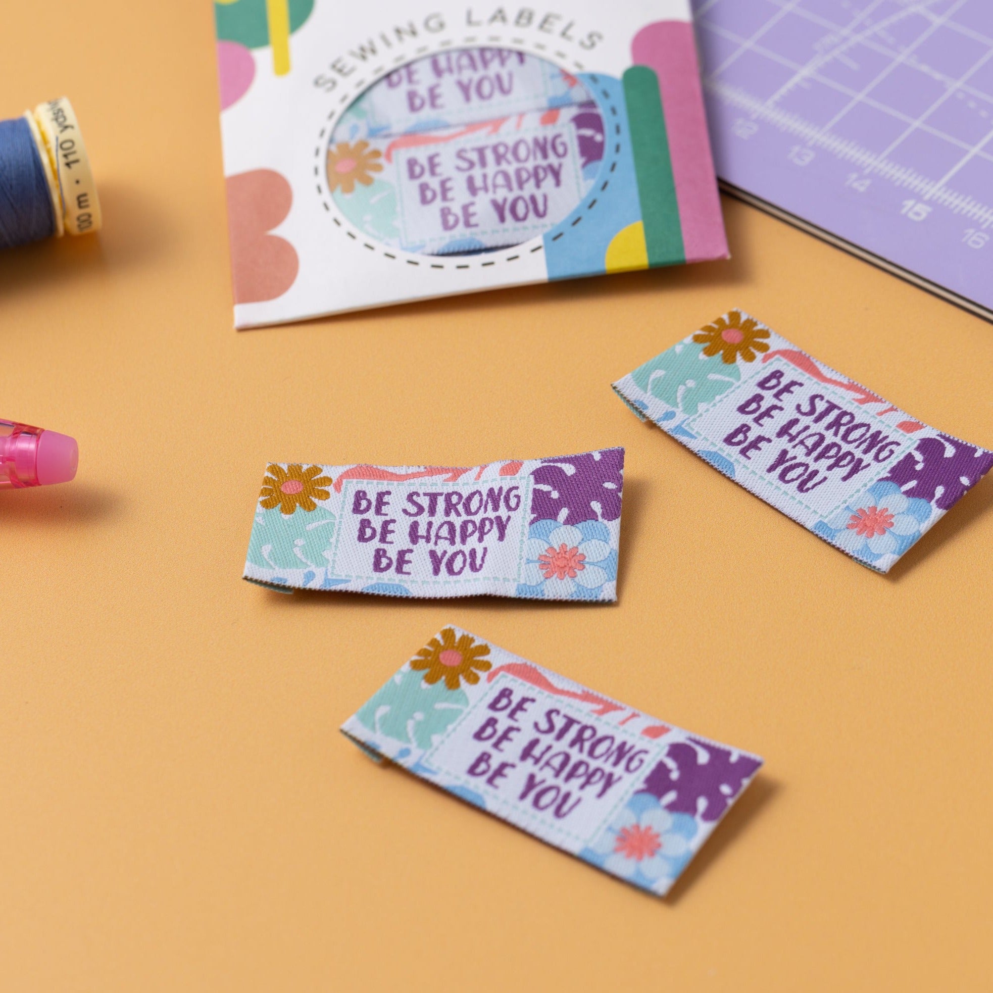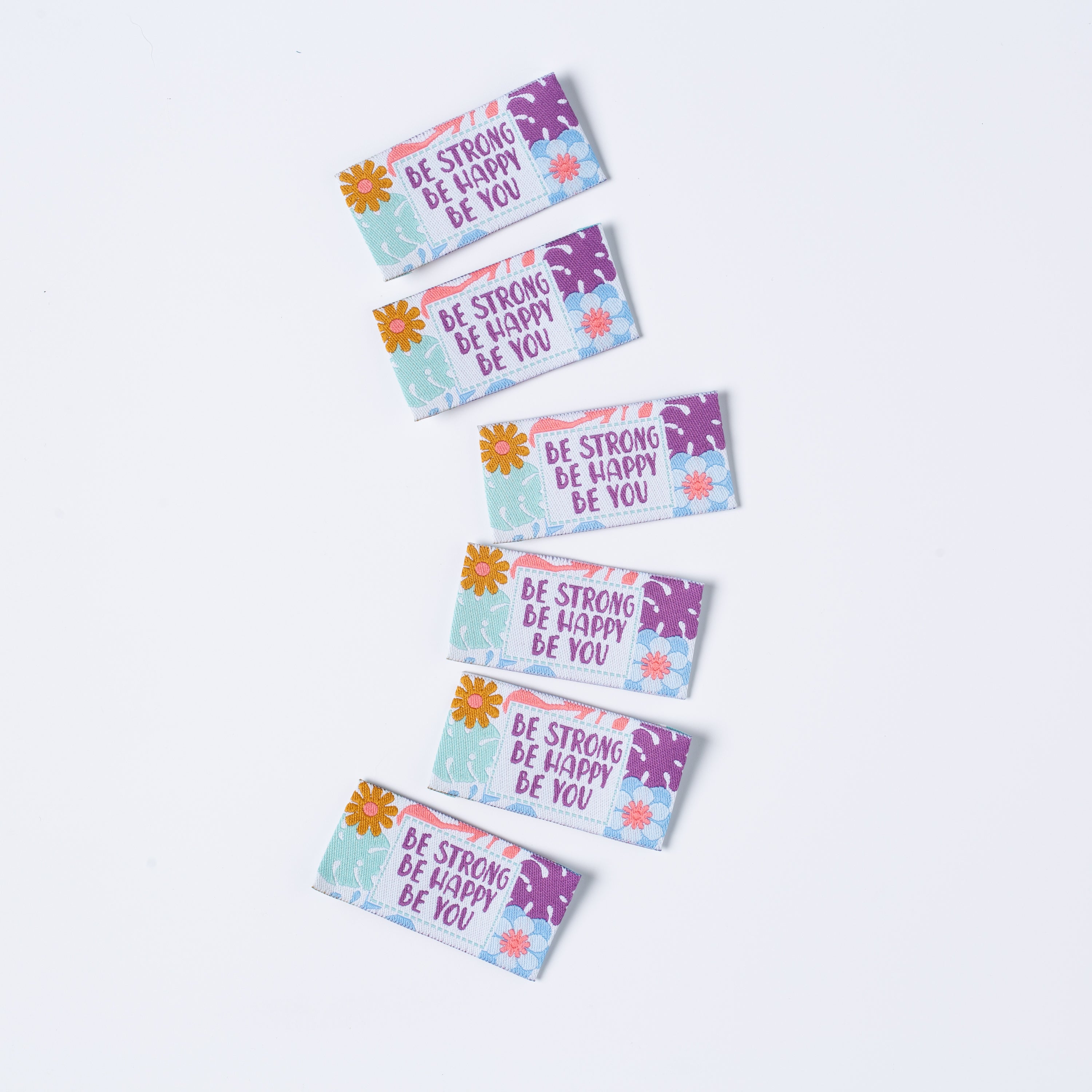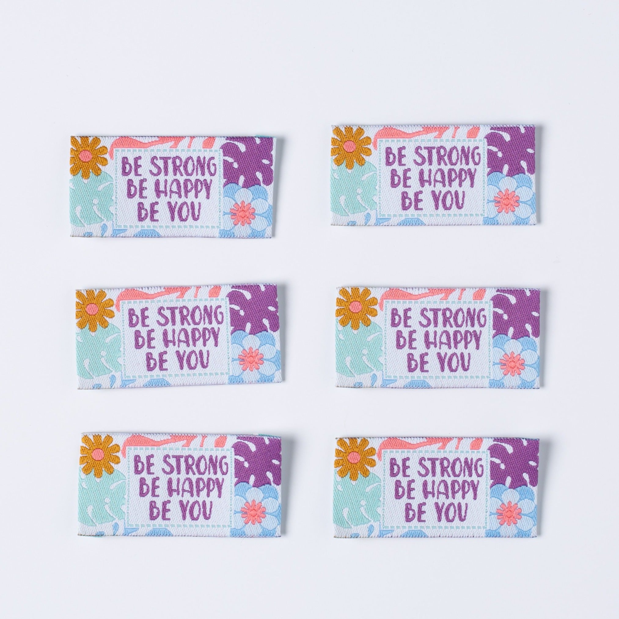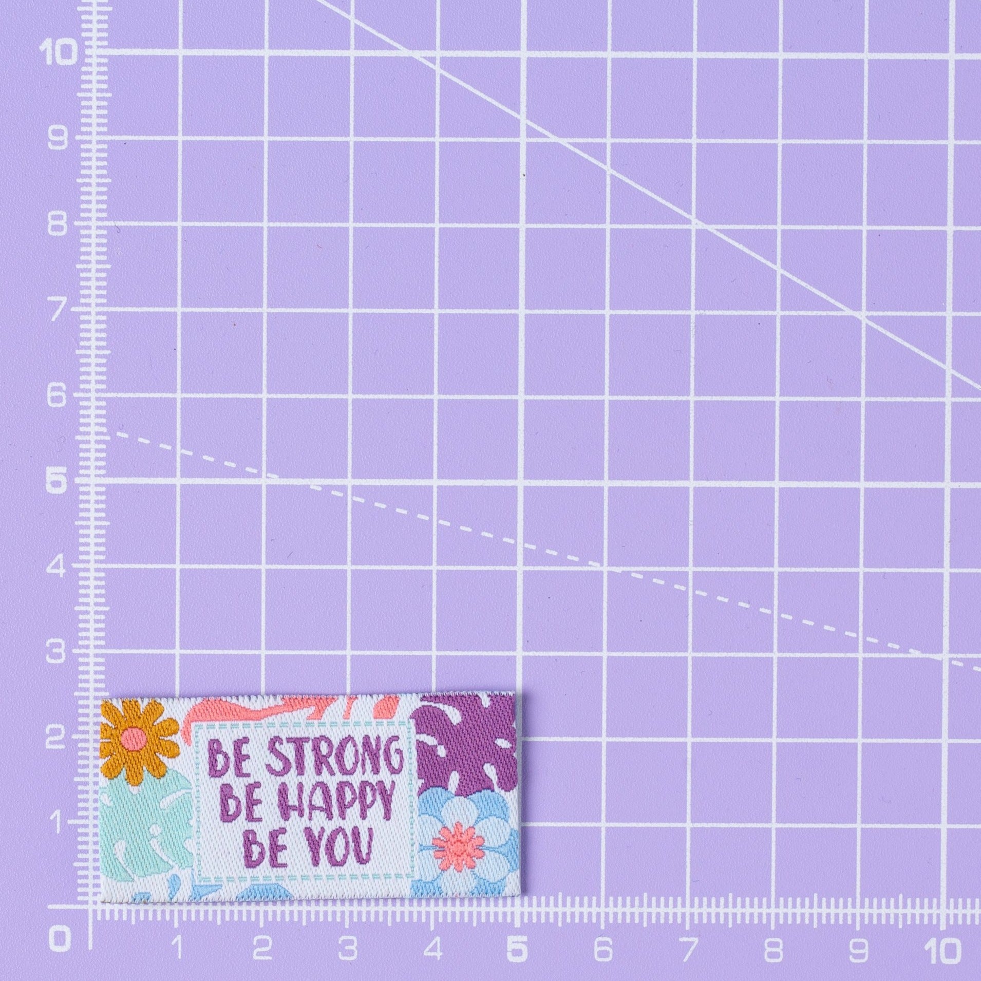 'Be Strong, Be Happy, Be You' woven in purple thread on a white background bordered by bright flowers and plants