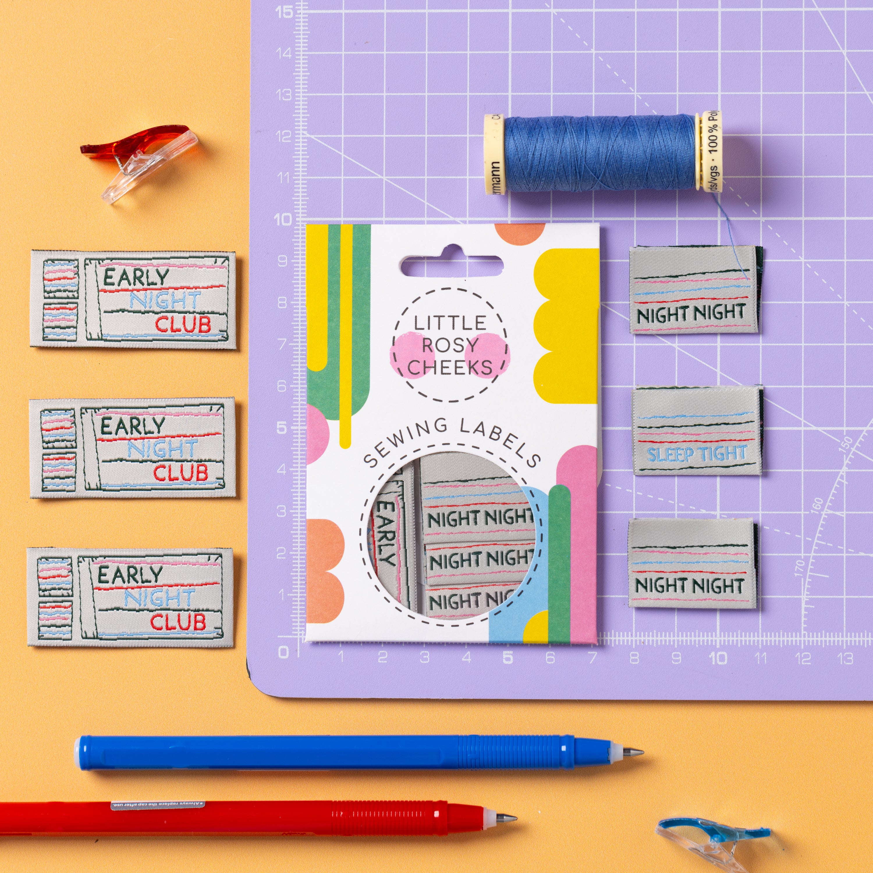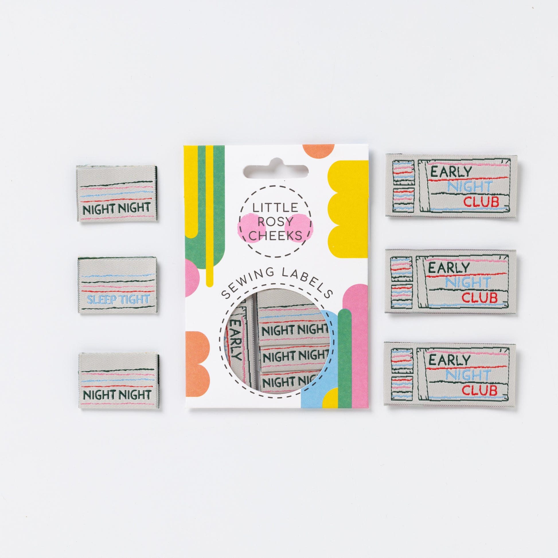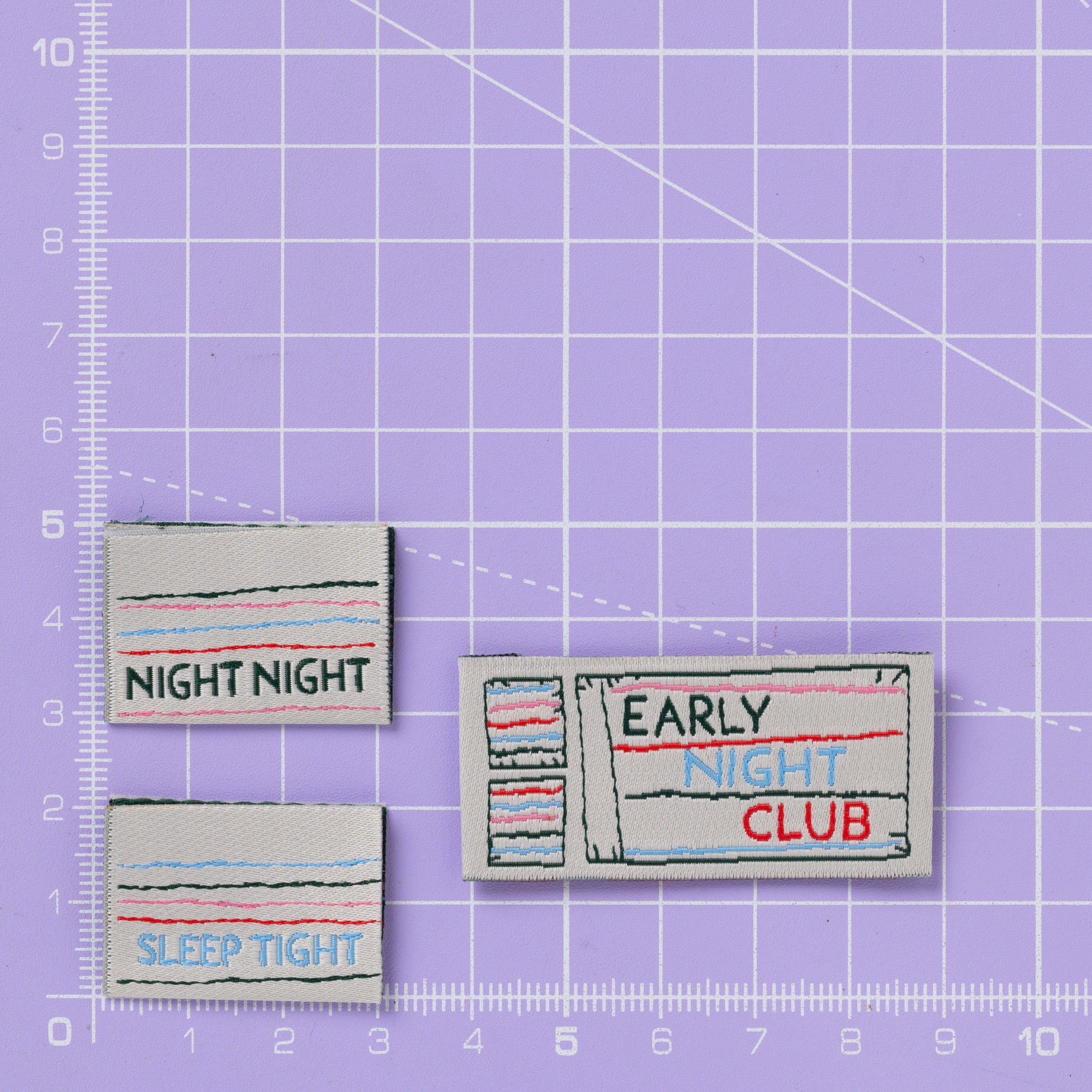 Celebrate the magic of pyjama and duvet days with our charming woven labels. Featuring the phrases Early Night Club and Night Night Sleep Tight, each label has a soft ecru background, adorned with muted blues, greens, and reds for a vintage, relaxed feel. Perfect for pyjamas, blankets, or loungewear, these labels add a touch of personality and comfort to your favourite snuggle-time creations.