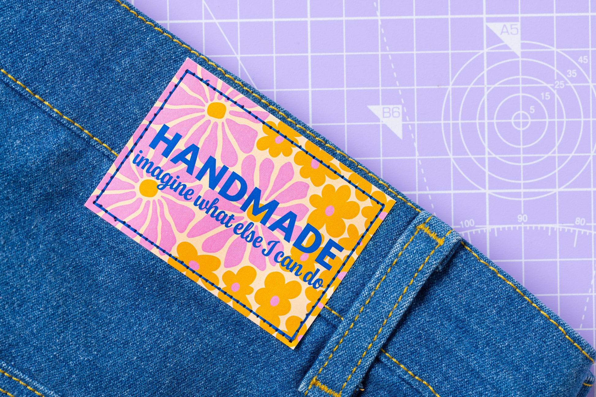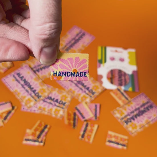 The Bold Blooms Label & Patch Pack is a bright new duo designed especially for jeans, trousers, and bags. This matching set includes a small in-seam woven label and a unique paper patch, both featuring the word 'handmade' in striking blue lettering on a vibrant pink, orange, and yellow floral background.