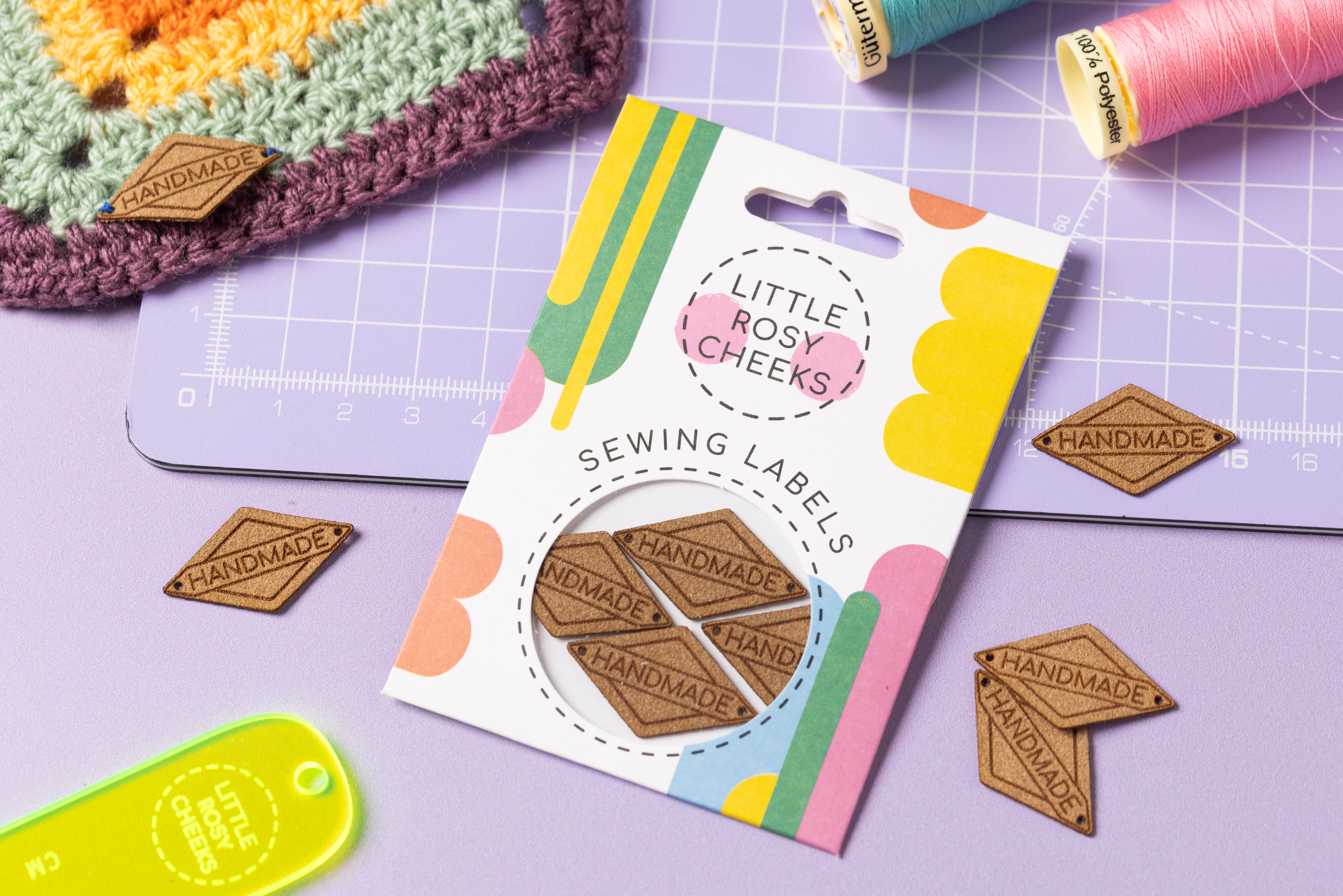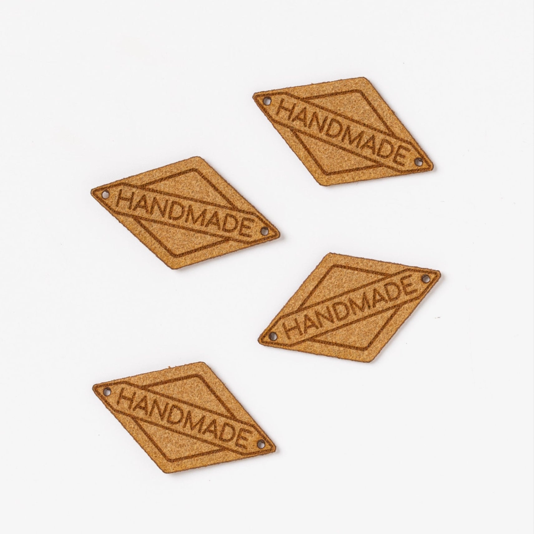 Our new vegan suede labels are the perfect finishing touch to your knitting, crochet and quilt projects. Handmade is engraved onto a camel colour and features a classy diamond shape. With 2 holes on either side of the label they are super easy to sew on too.