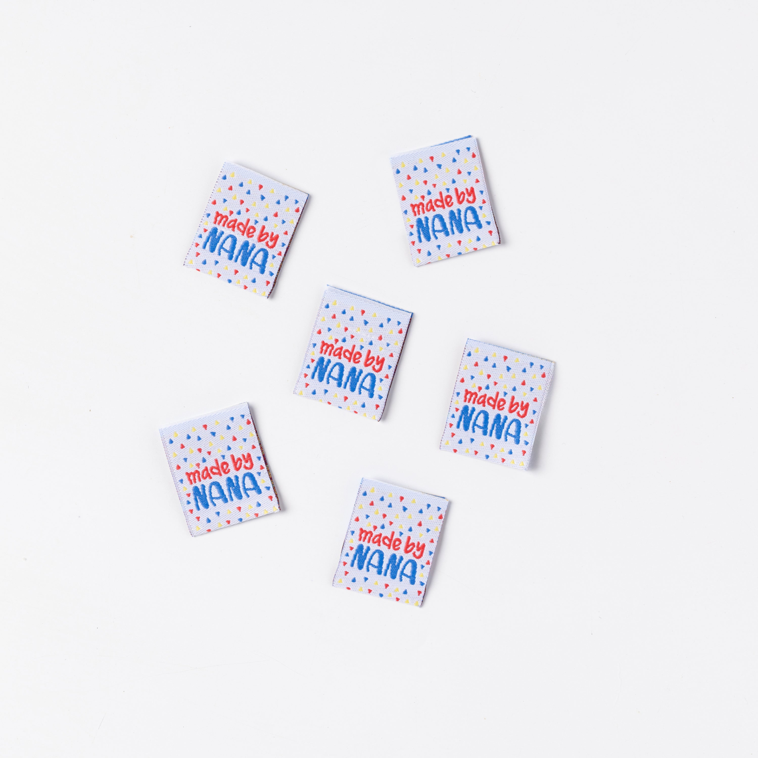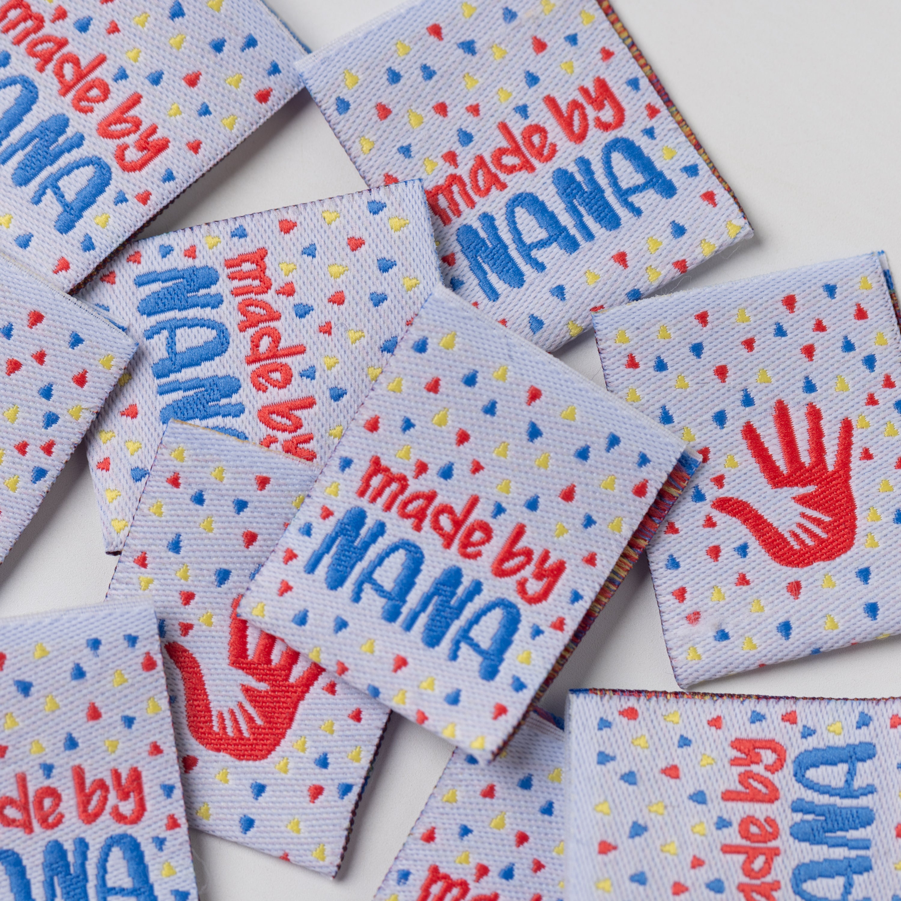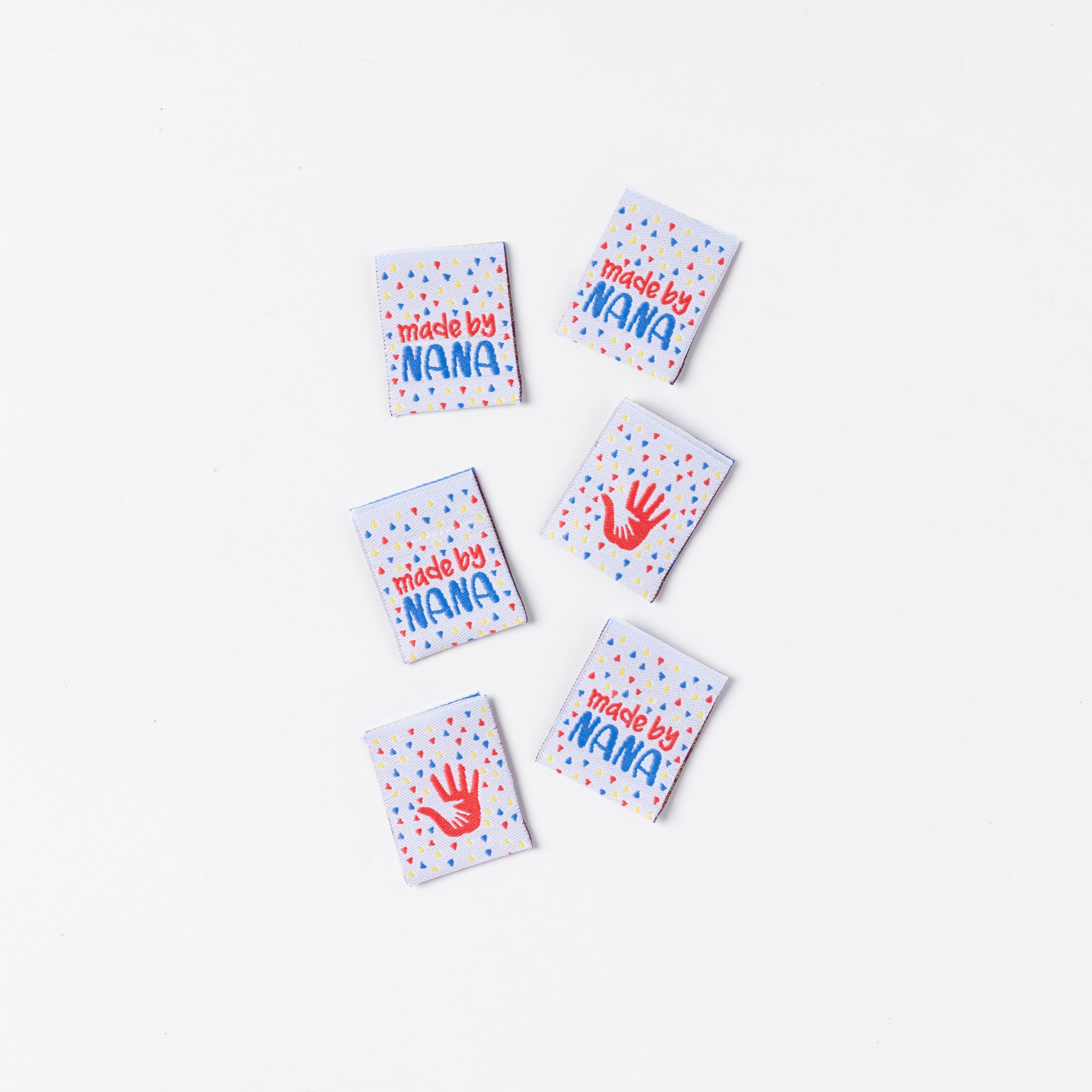 Made by Nana woven in a blue and red thread with a white background and fun confetti in yellow, blue and coral. On the reverse features our popular loving hands emblem.
