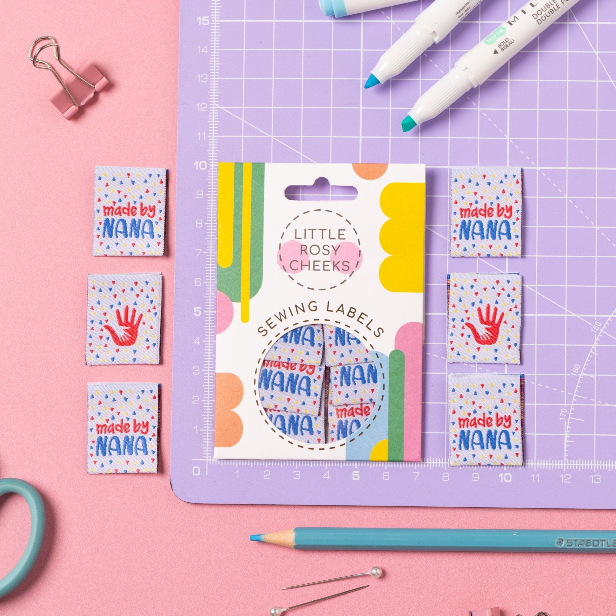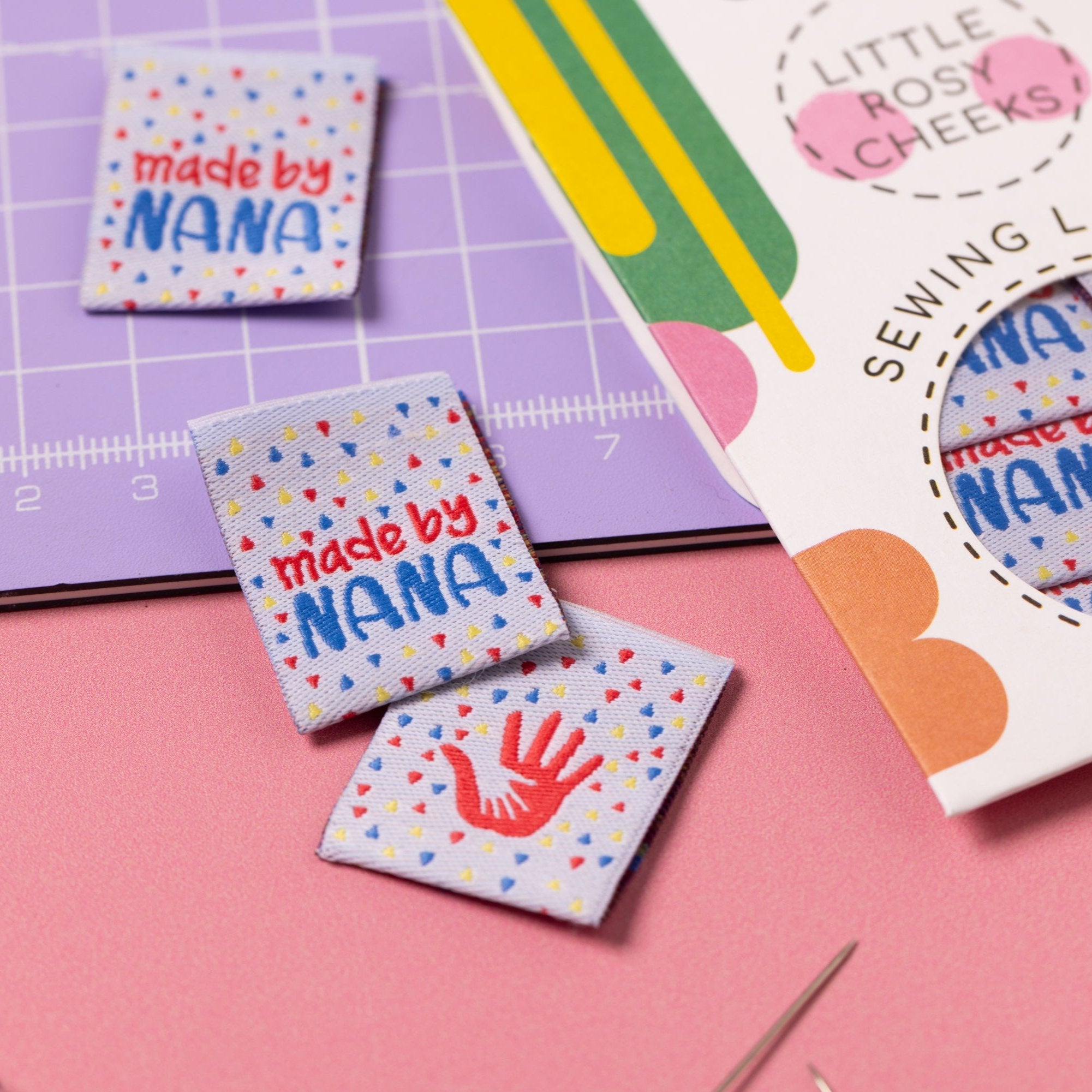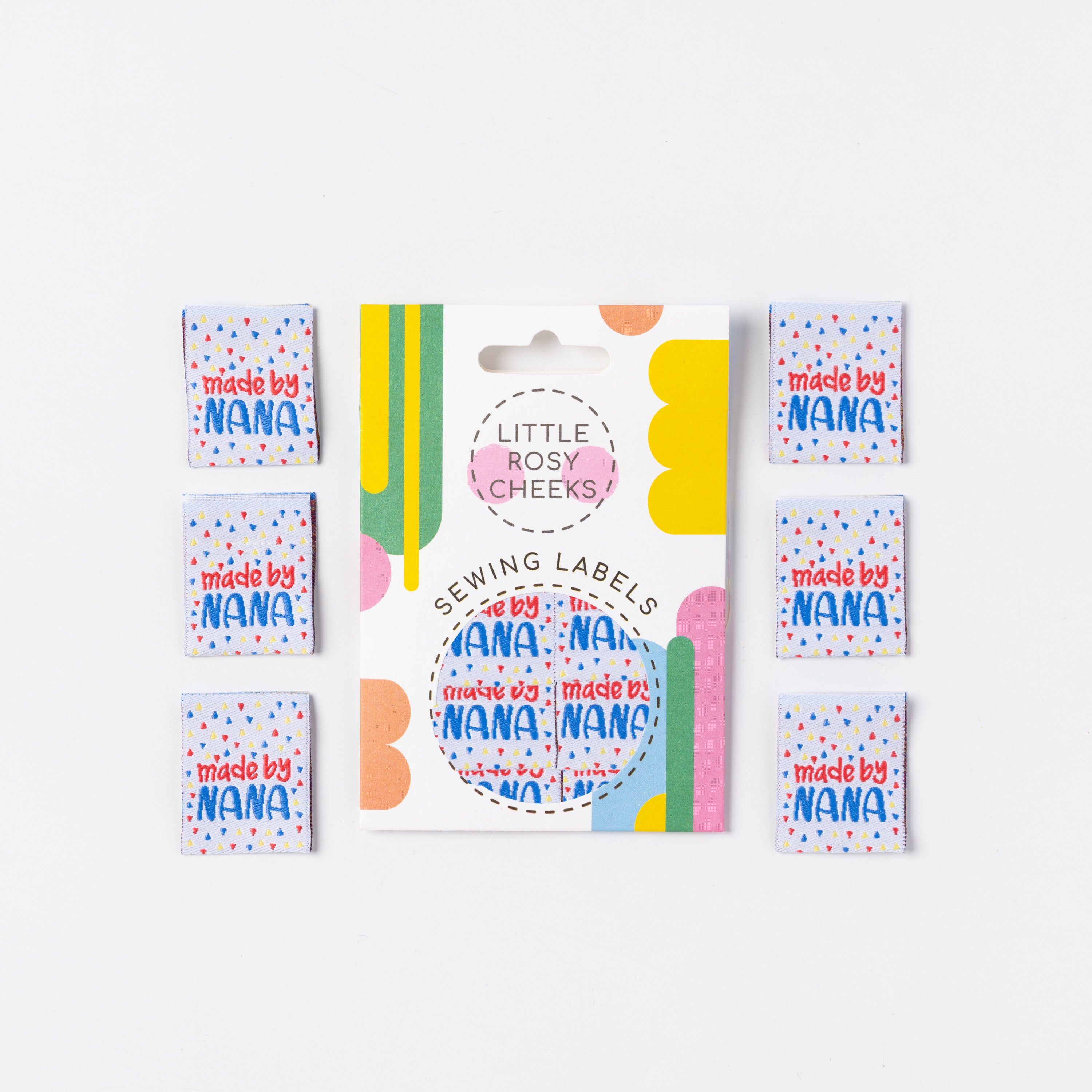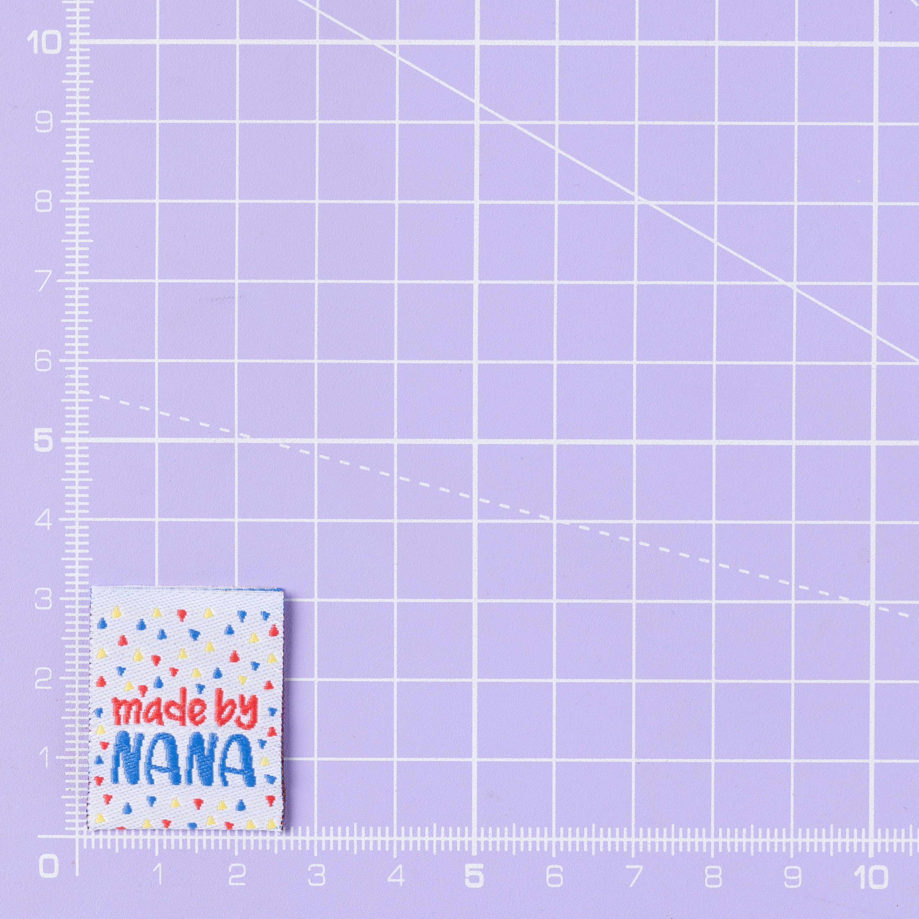 Made by Nana woven in a blue and red thread with a white background and fun confetti in yellow, blue and coral. On the reverse features our popular loving hands emblem.