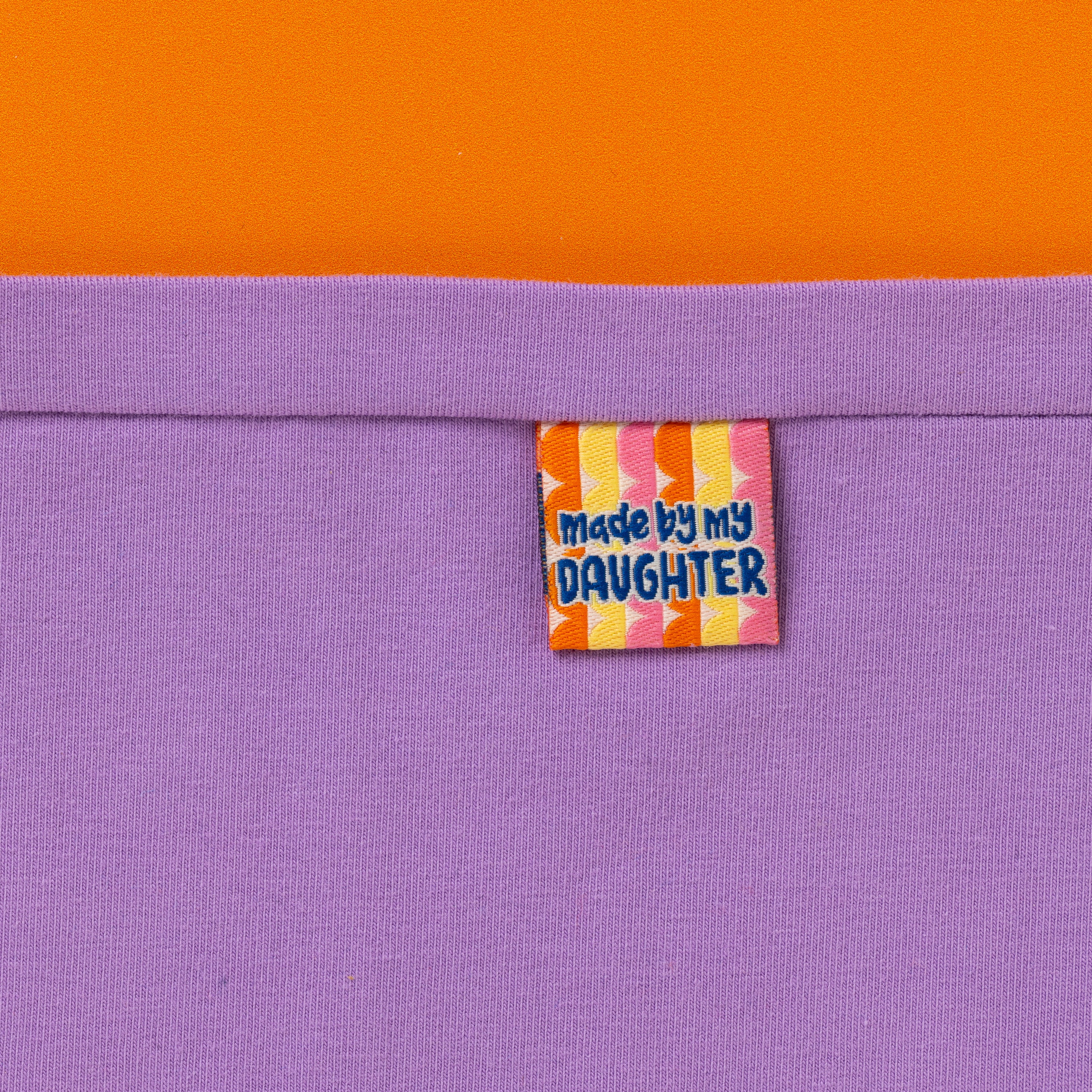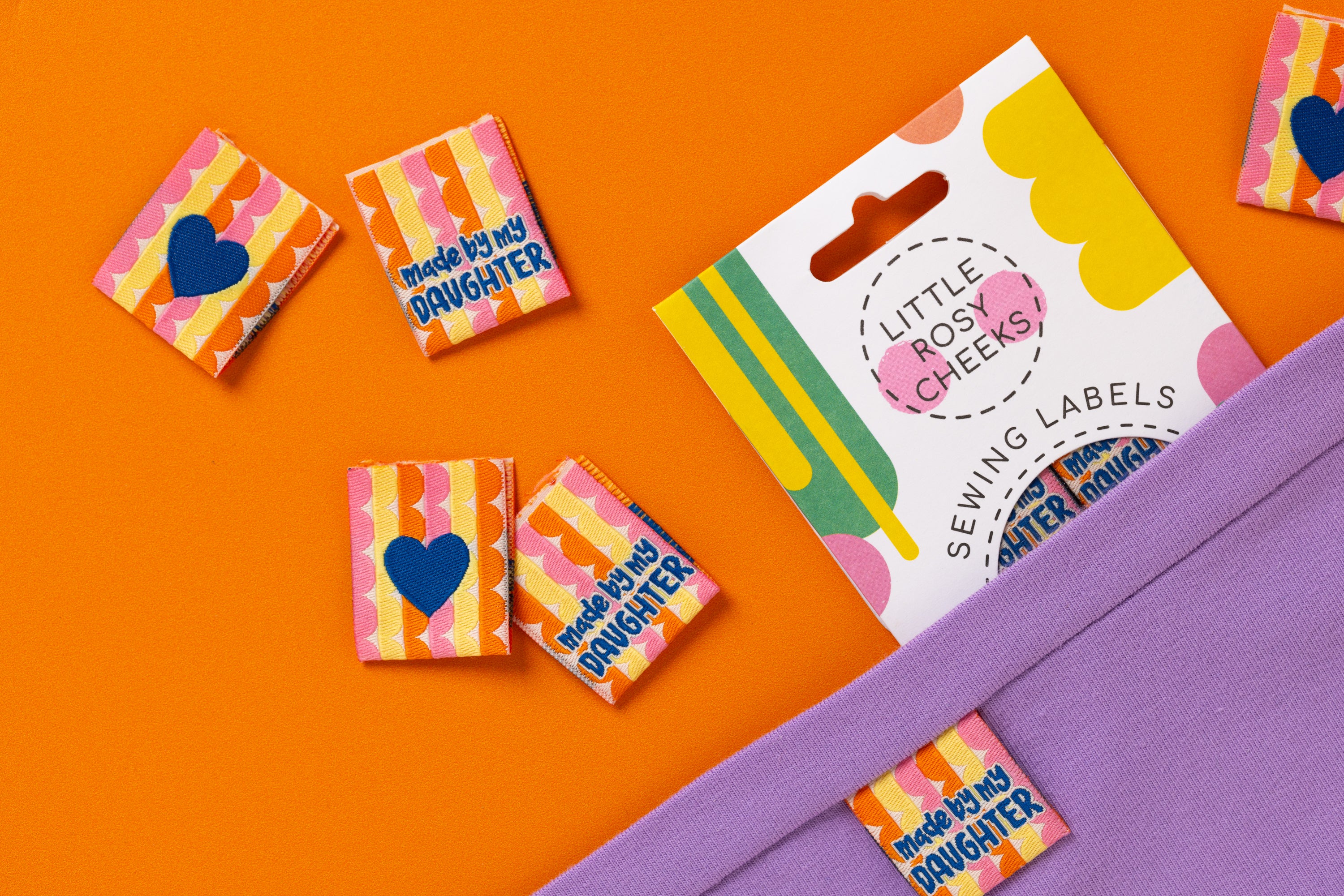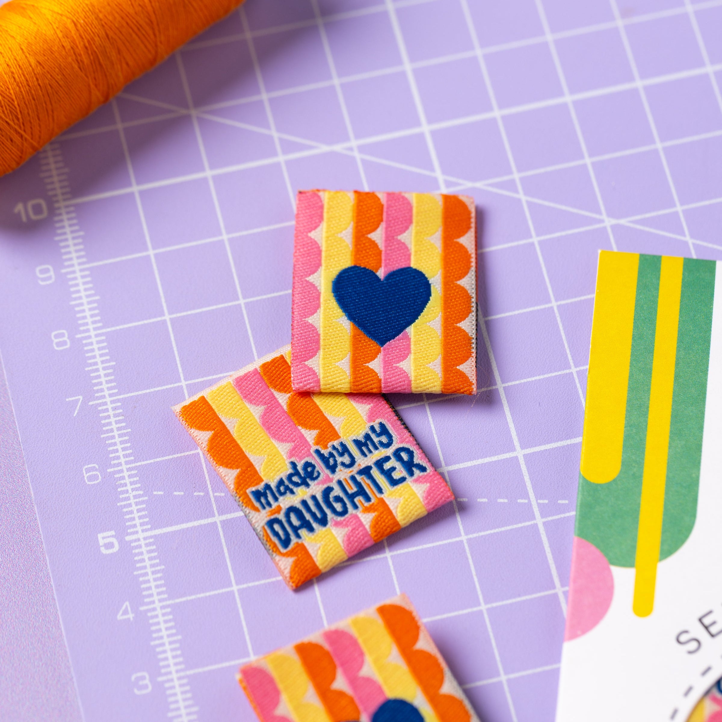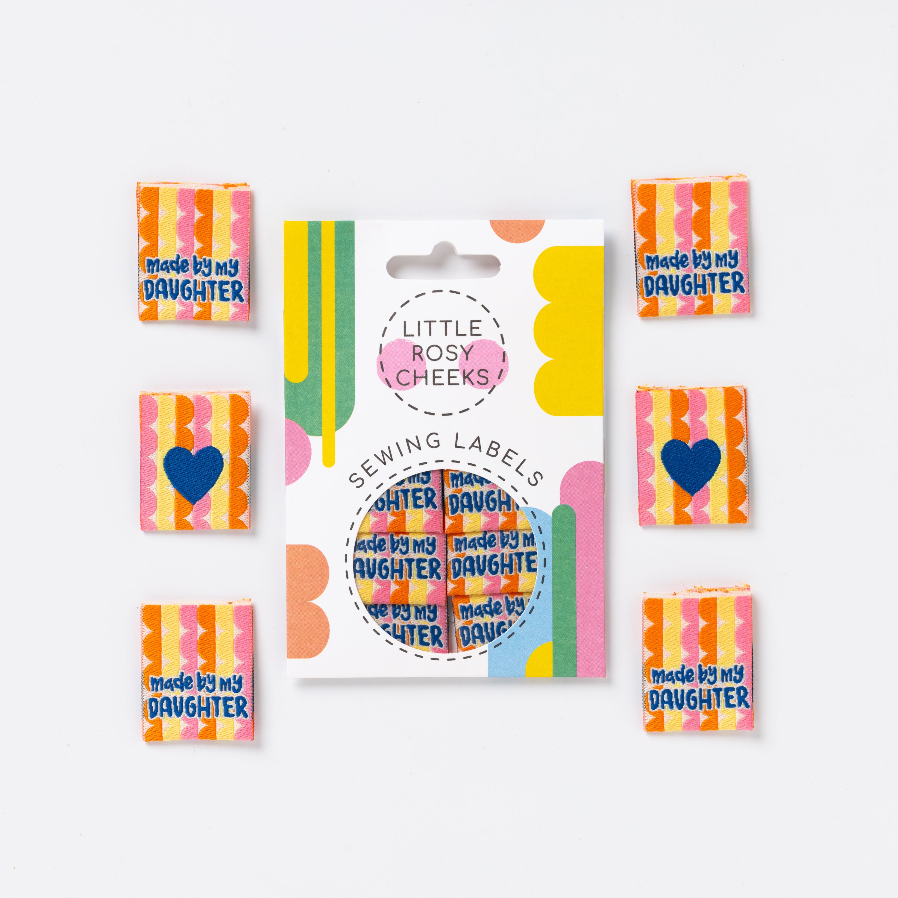 Made by My Daughter – a sweet label for the crafty daughter who wants to show just how much they love their parent. The soft ivory background is scattered with pink, yellow, and orange hearts, each one a little symbol of joy and love sewn into every stitch.