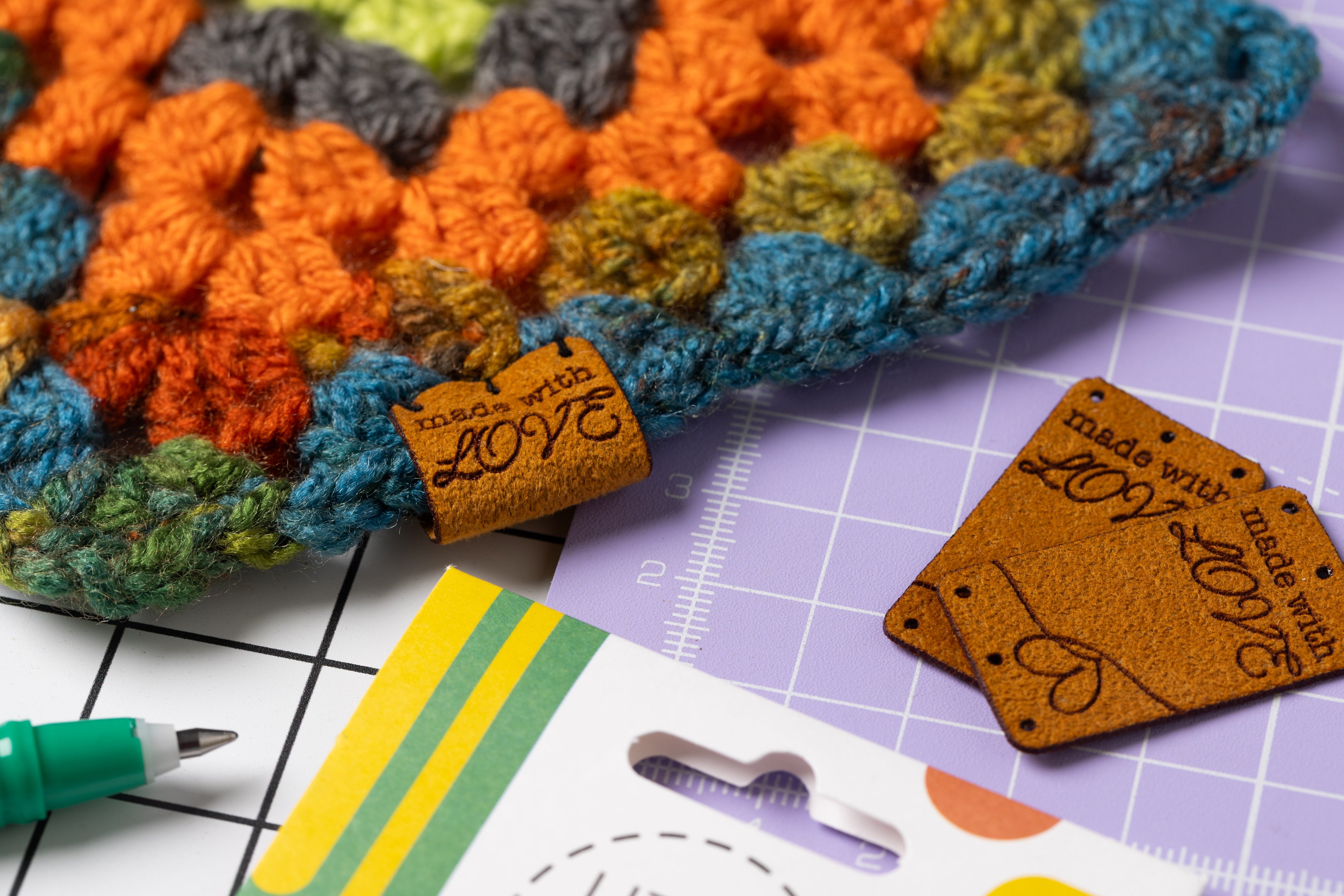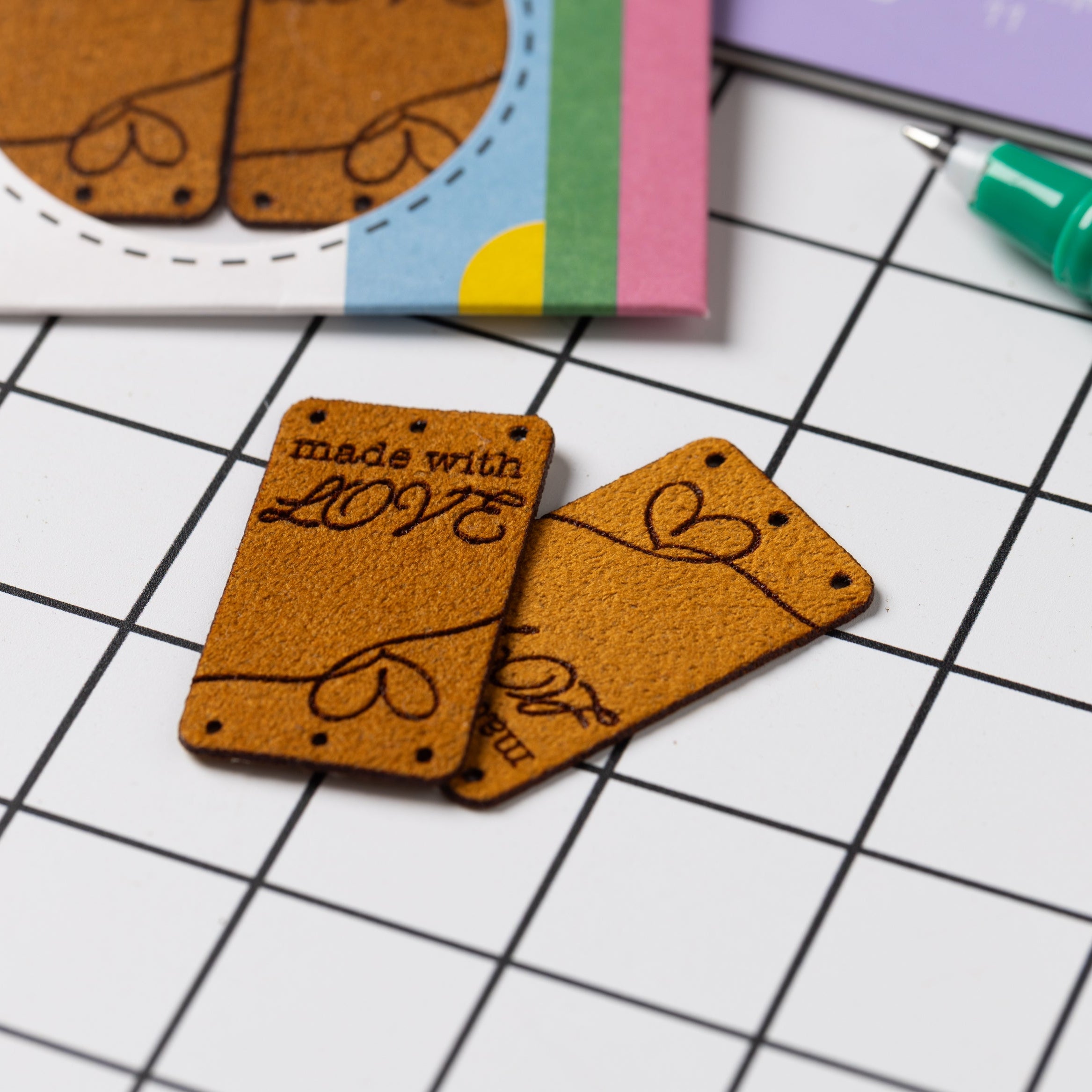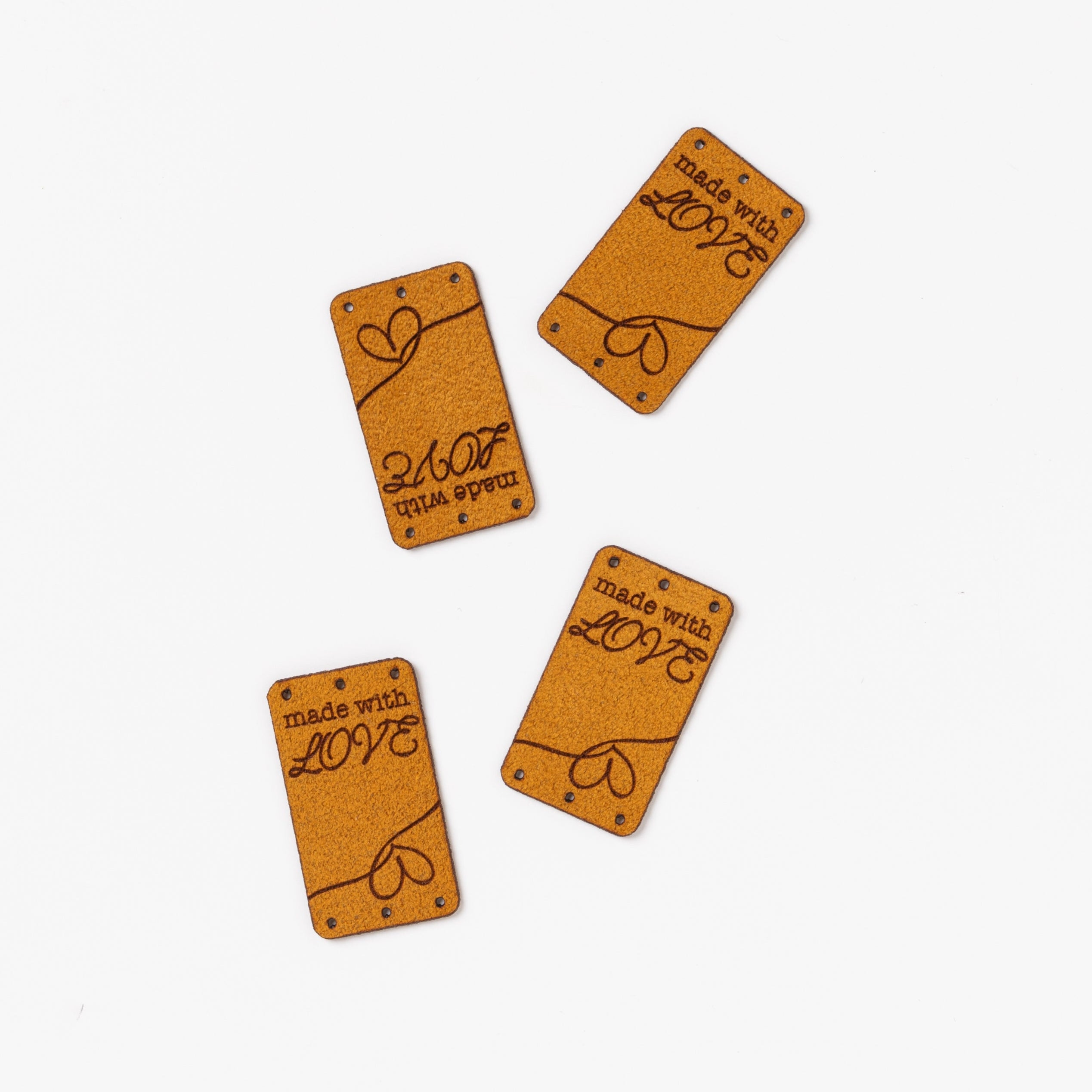 Our new vegan suede labels are the perfect finishing touch to your knitting, crochet and quilt projects. Made with love is engraved onto a warm rusty colour and features a cute double heart design. This label is designed to fold over the bottom of your creation and has 3 holes making this easy to sew on.