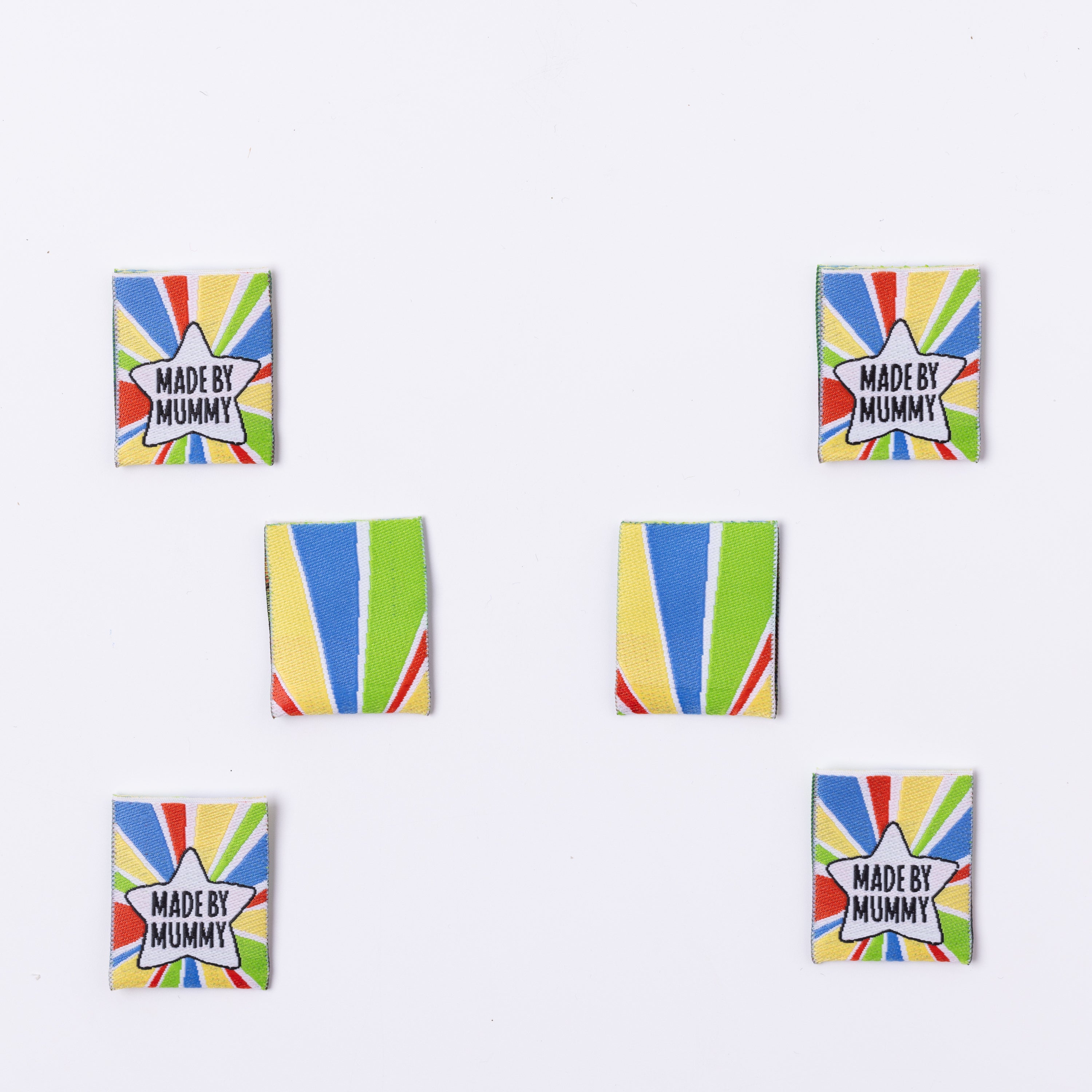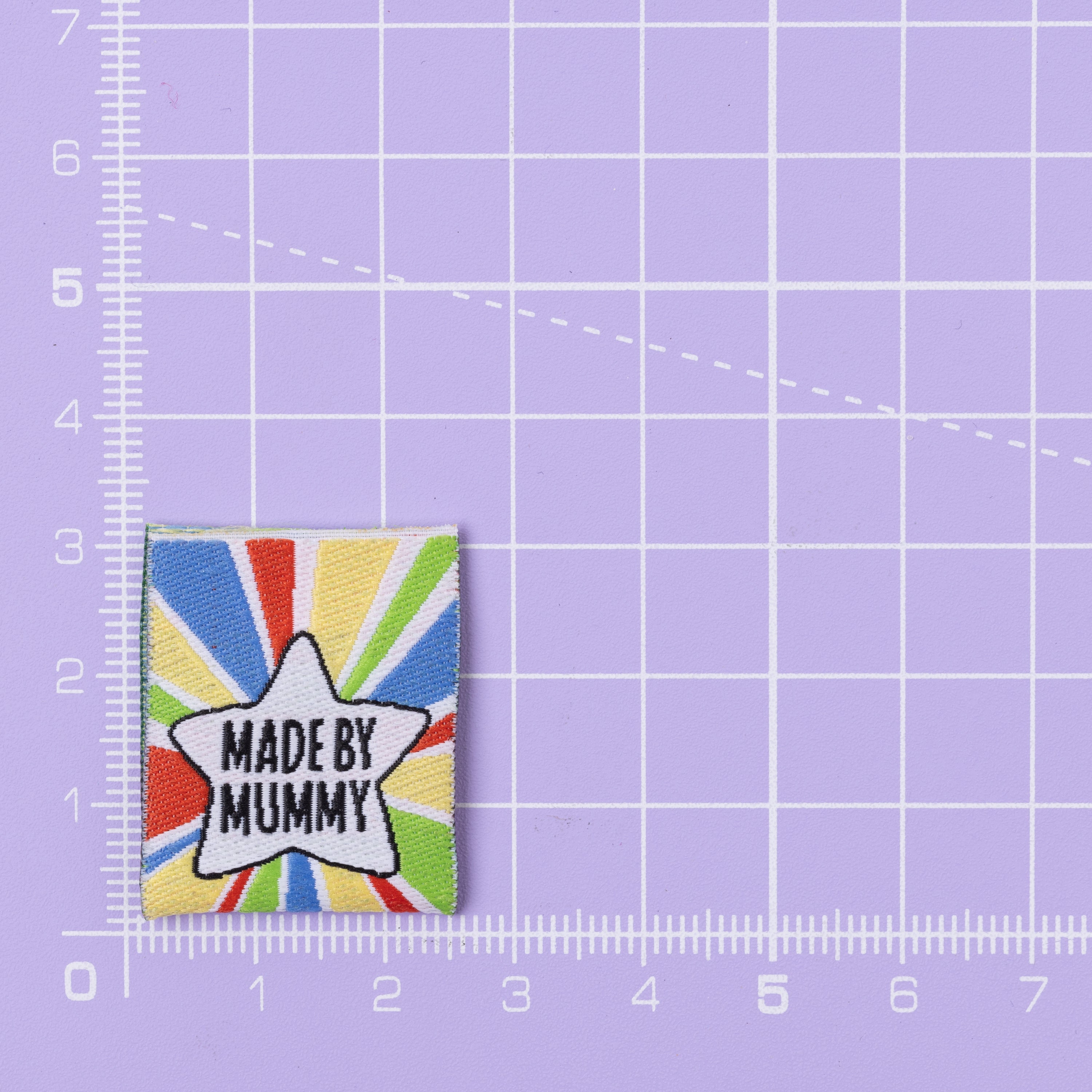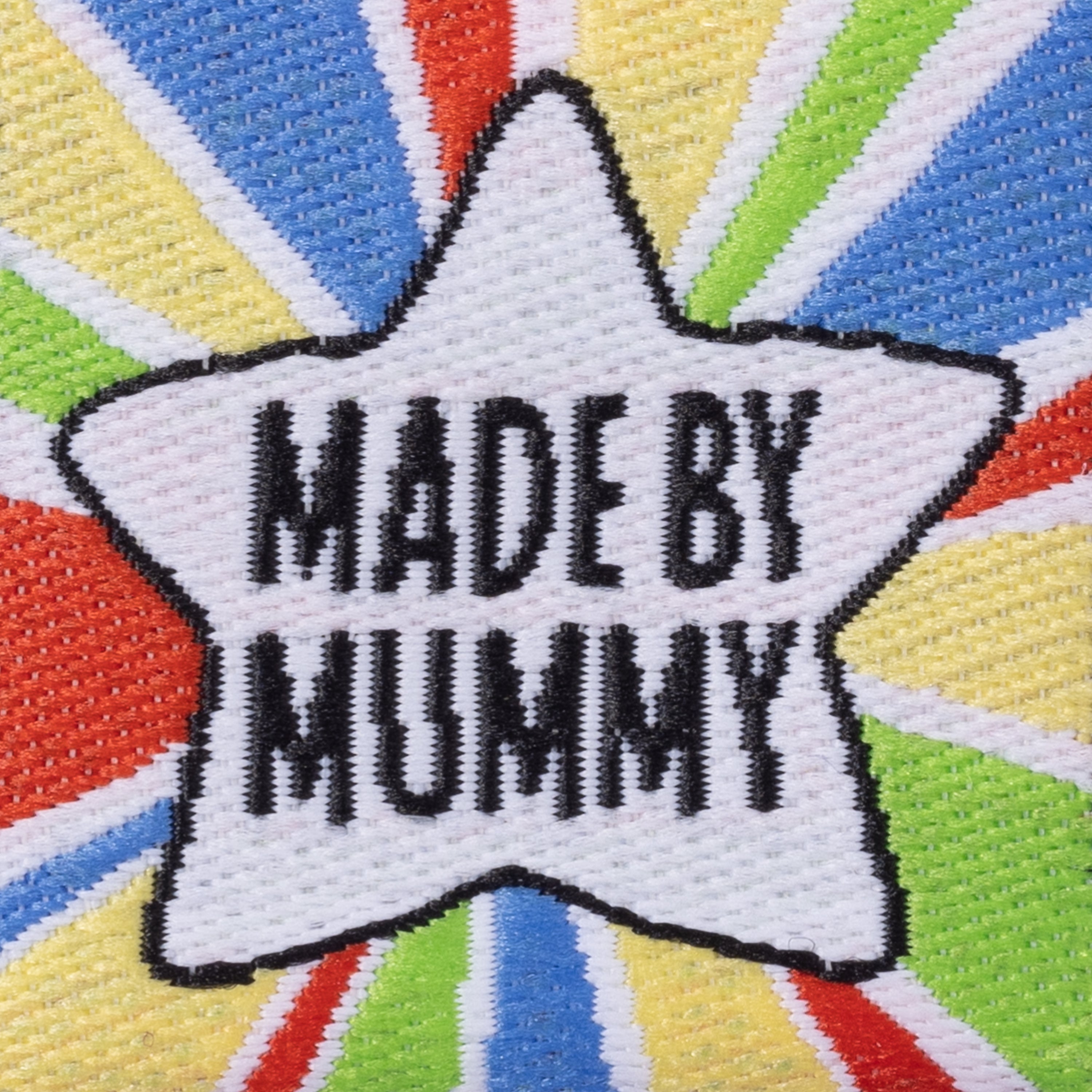 'Mummy's Star has Made By Mummy woven on to a white star with red, blue, green and yellow beams shooting from it. The beams carry on to the back of the label.