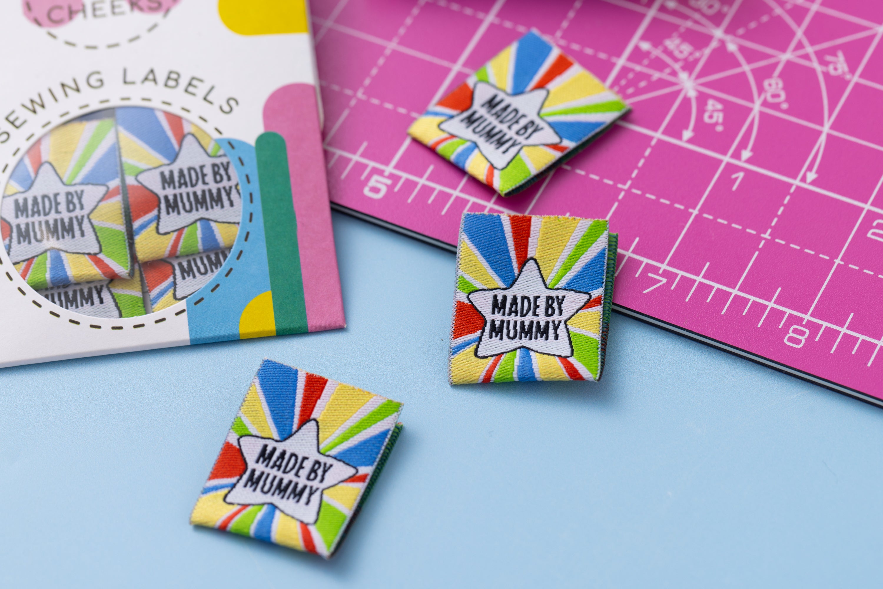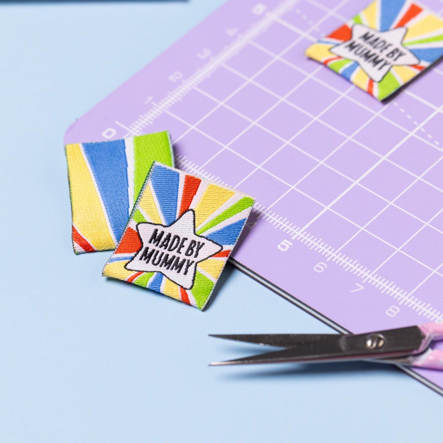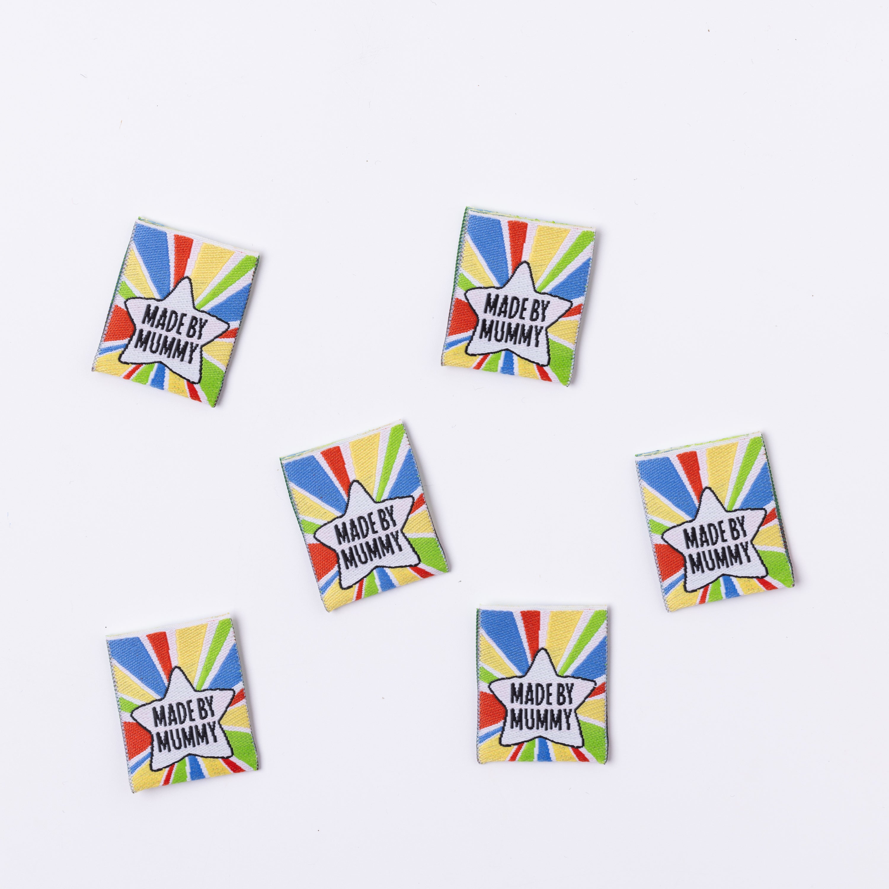 'Mummy's Star has Made By Mummy woven on to a white star with red, blue, green and yellow beams shooting from it. The beams carry on to the back of the label.