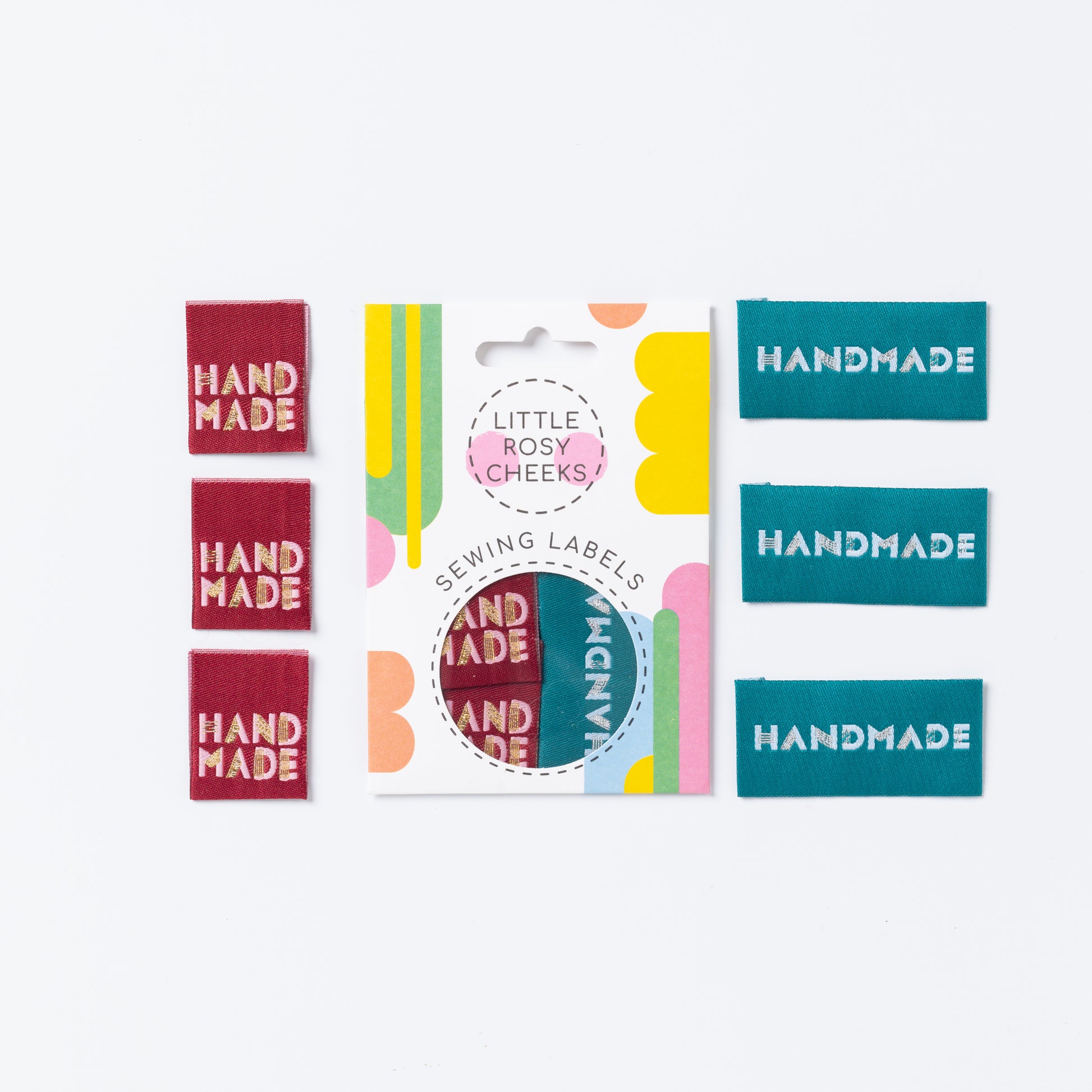 The first label boasts a rich berry background with eye-catching "HANDMADE" lettering in pink and shimmering gold thread, designed with a centre fold. The second label presents a teal backdrop with "HANDMADE" in crisp ice blue lettering and striking silver threads, featuring an edge fold.