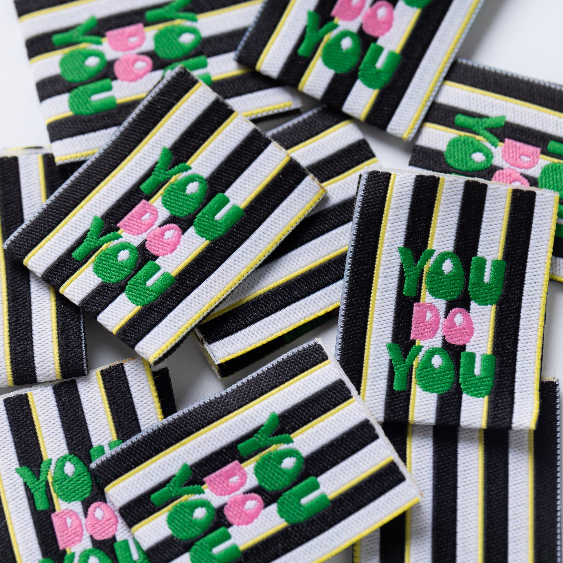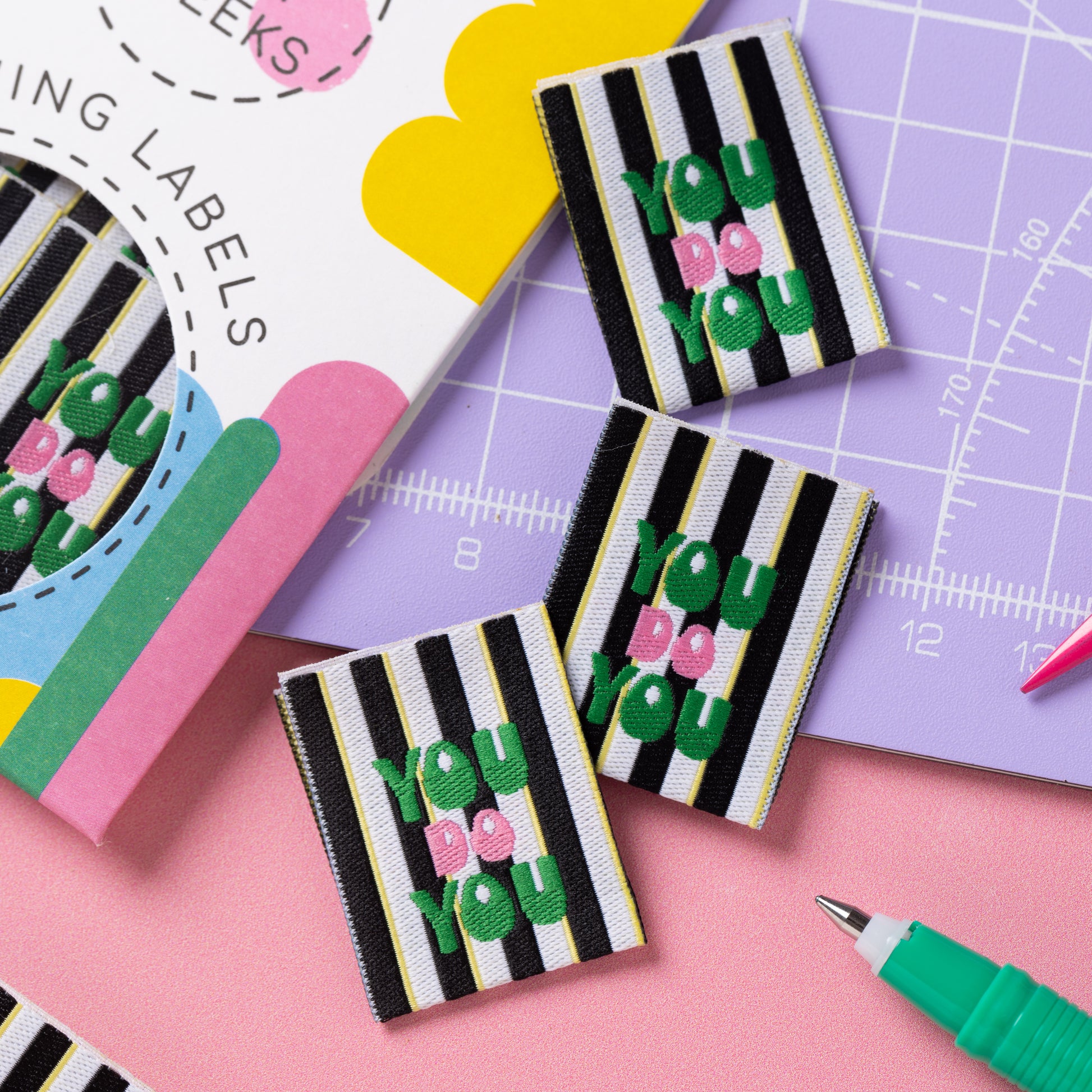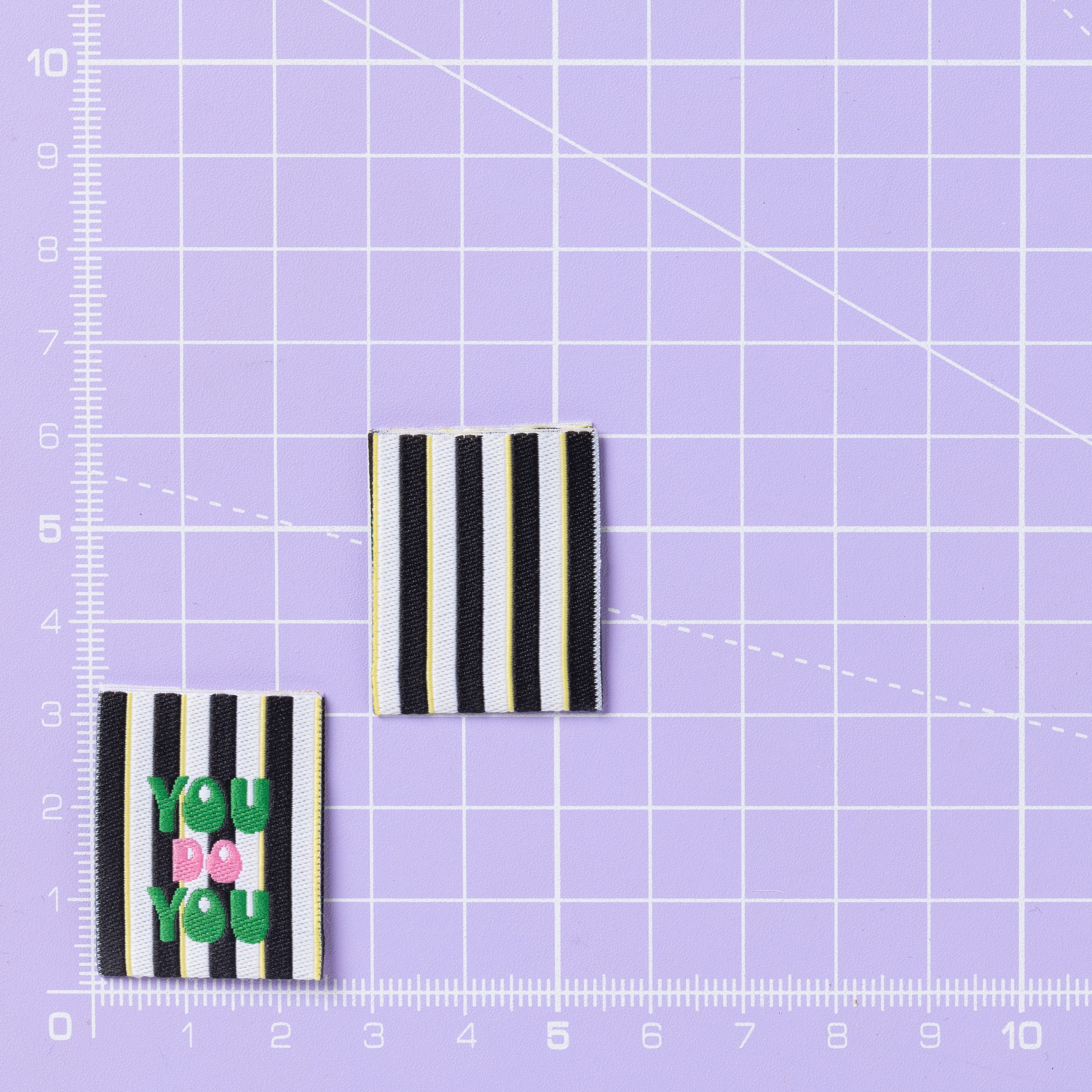 With a striking black, white, and yellow stripe background and playful green and pink lettering, this label adds a confident pop of colour and attitude to any make. Perfect for garments that express your true self.