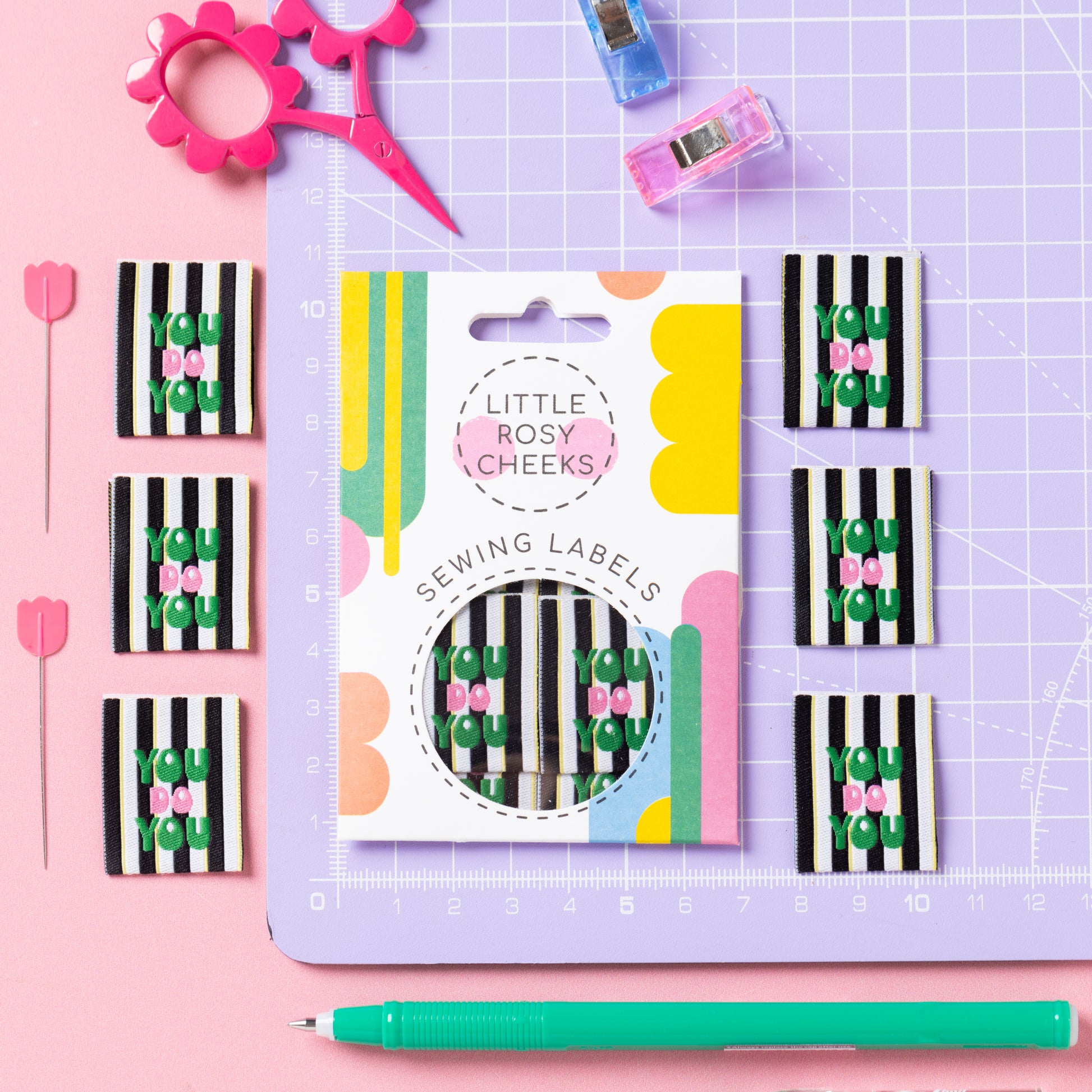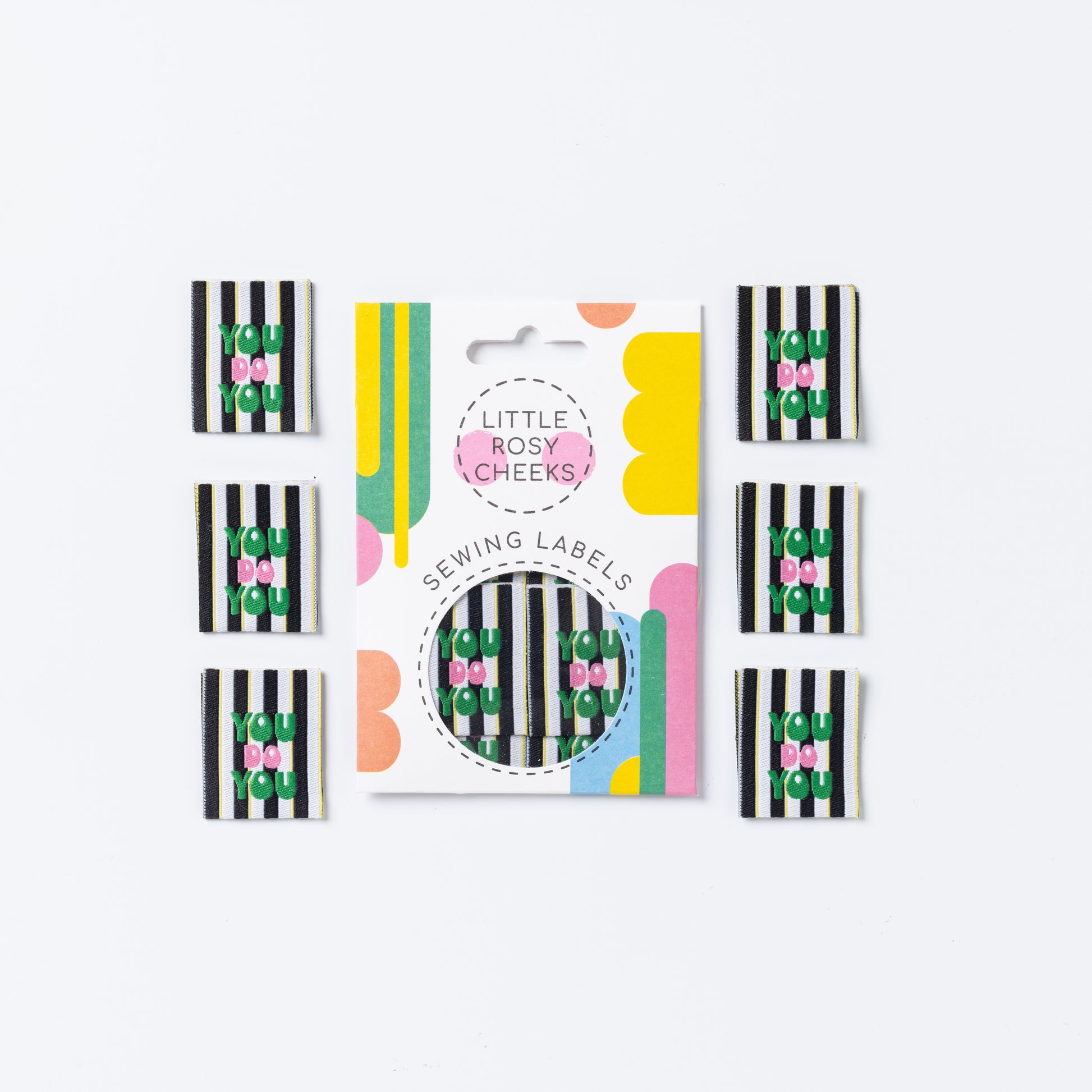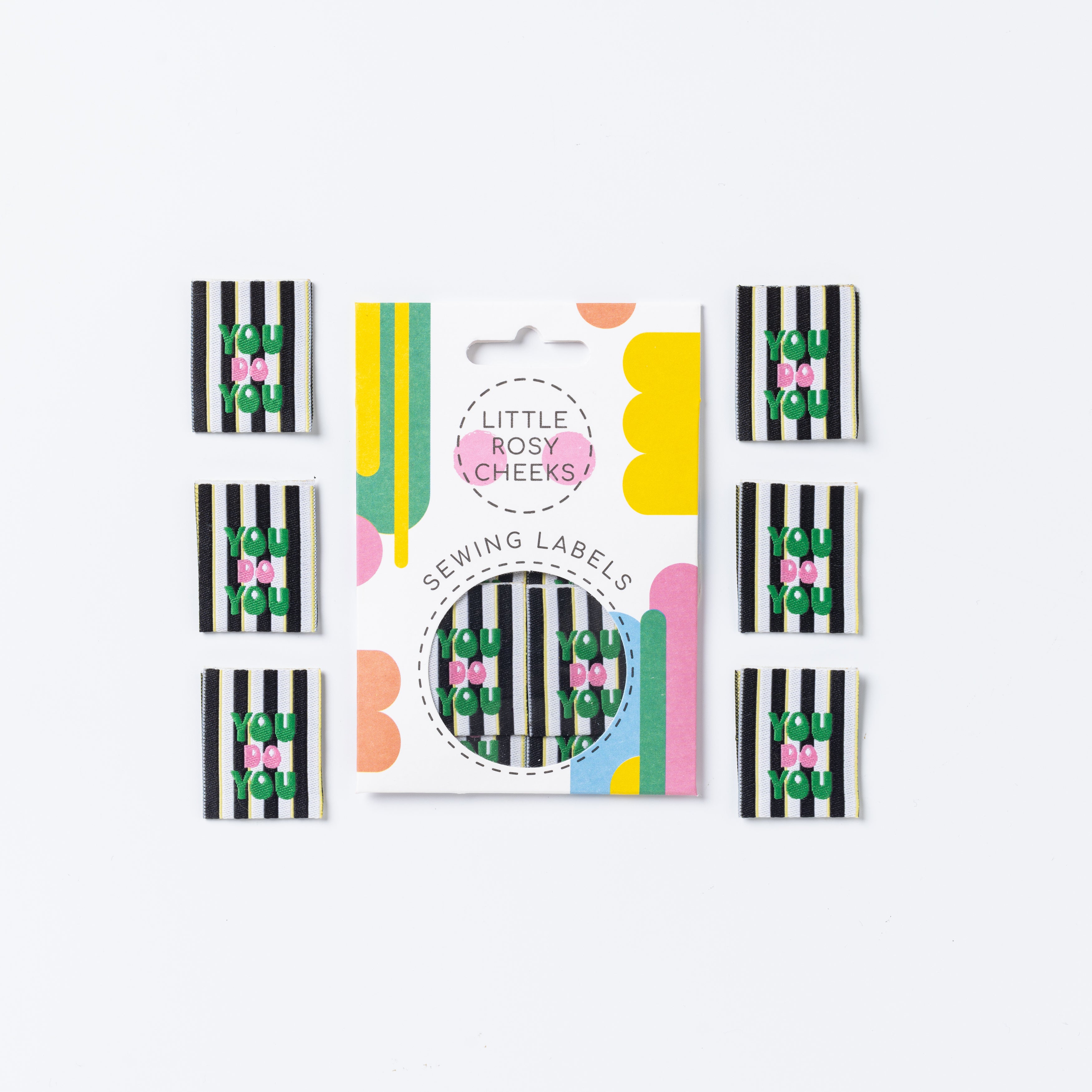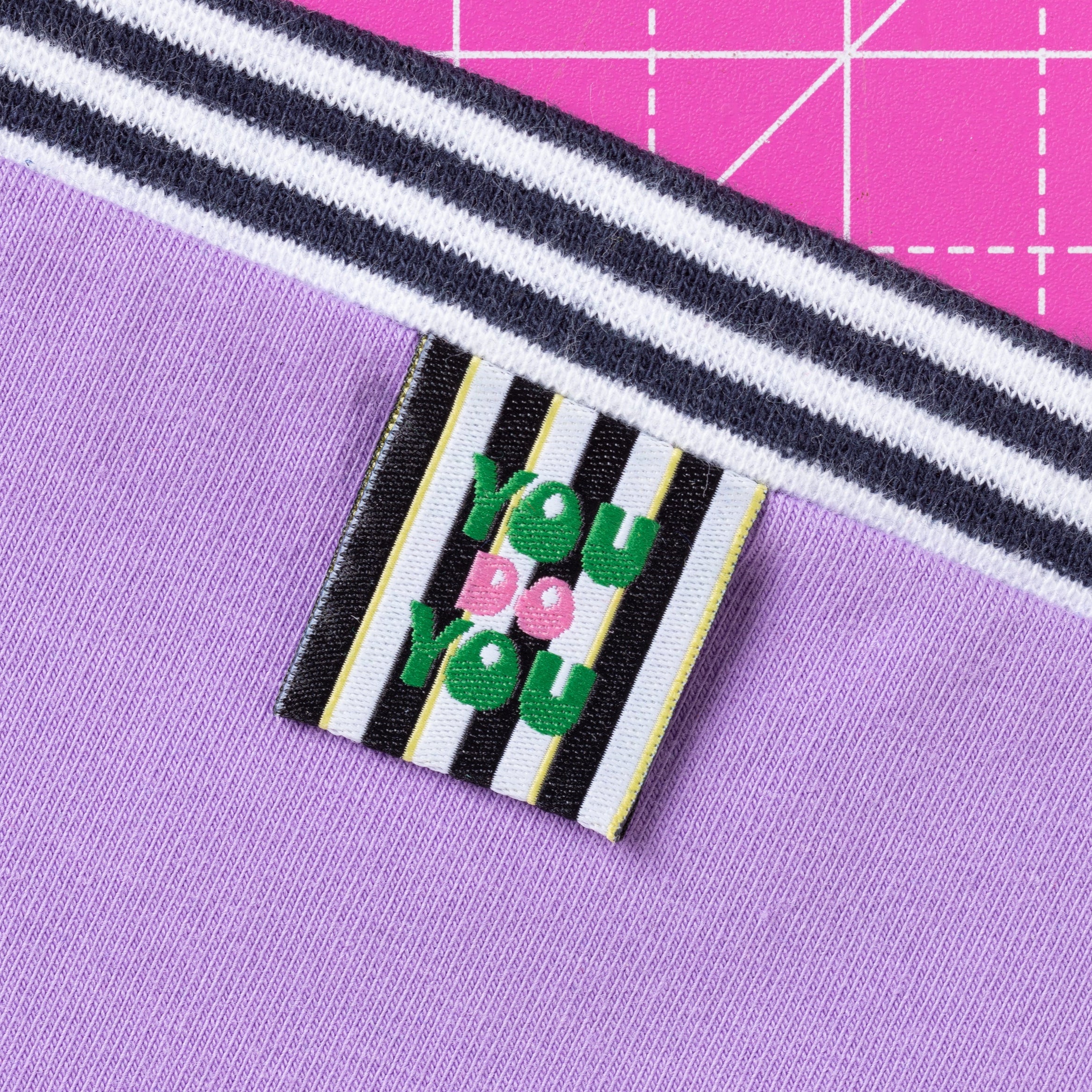 With a striking black, white, and yellow stripe background and playful green and pink lettering, this label adds a confident pop of colour and attitude to any make. Perfect for garments that express your true self.